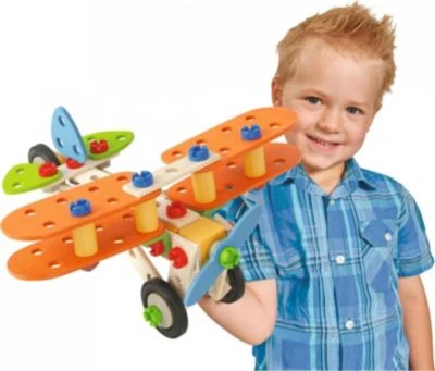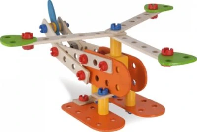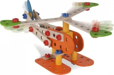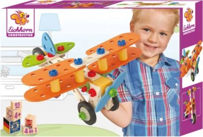 Dieses Eichhorn Constructor Set besteht aus 85 Teilen und ermöglicht den Bau von mindestens vier verschiedenen Modellen wie einem Dinosaurier, einem Doppeldecker, einem Wasserhelikopter oder einem Motorrad.