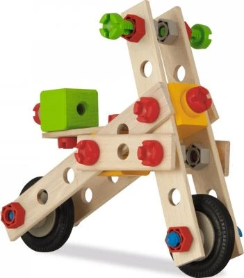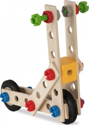 Für alle kleinen und großen Baumeister*innen kommt mit diesem 65-teiligen Eichhorn Constructor Motorroller Set toller Spielespaß in die Kinderzimmer-Werkstatt. Mit dem Set können 4 Modelle gebaut werden: Das Motorrad, das Flugzeug, der Miniroller oder die Minilibelle werden mit den Verbindungselementen und den Schrauben zusammengesetzt. Werkzeug ist in dem Set bereits enthalten und eine Anleitung führt zu den fertigen Modellen. Die einzelnen Teile können natürlich auch kreativ zu ganz eigenen Konstruktionen verbunden werden. Das Set ist aus FSC-zertifiziertem Holz gefertigt und bietet langen und abwechslungsreichen Spiele- und Bauspaß. Ganz nebenher werden die Kreativität, die Hand-Augen-Koordination und die feinmotorischen Fähigkeiten gefördert.