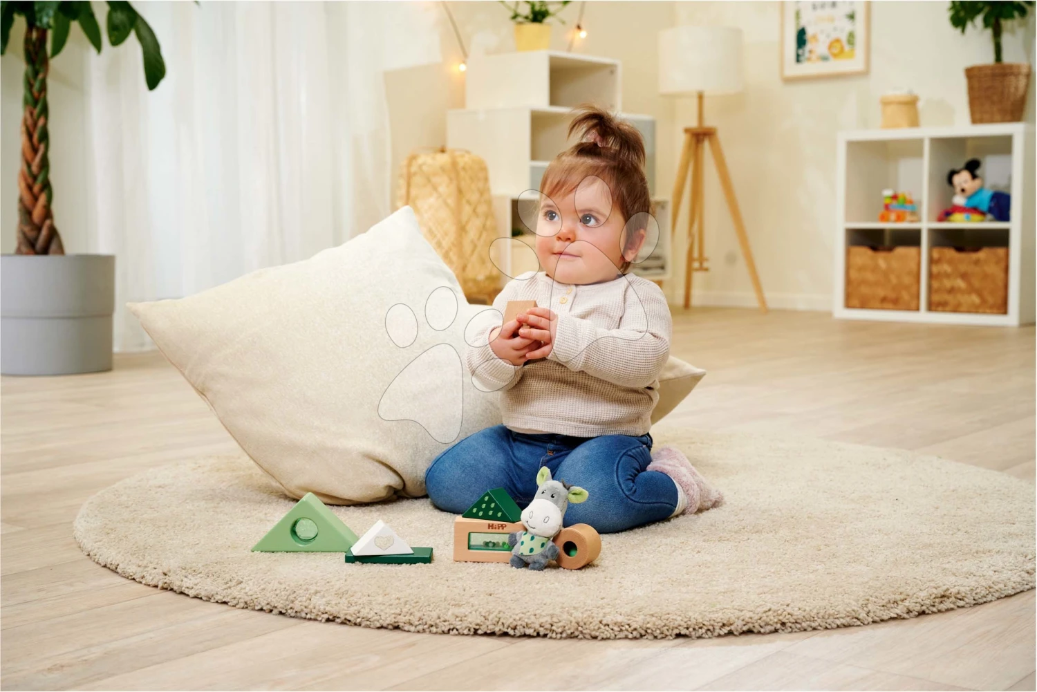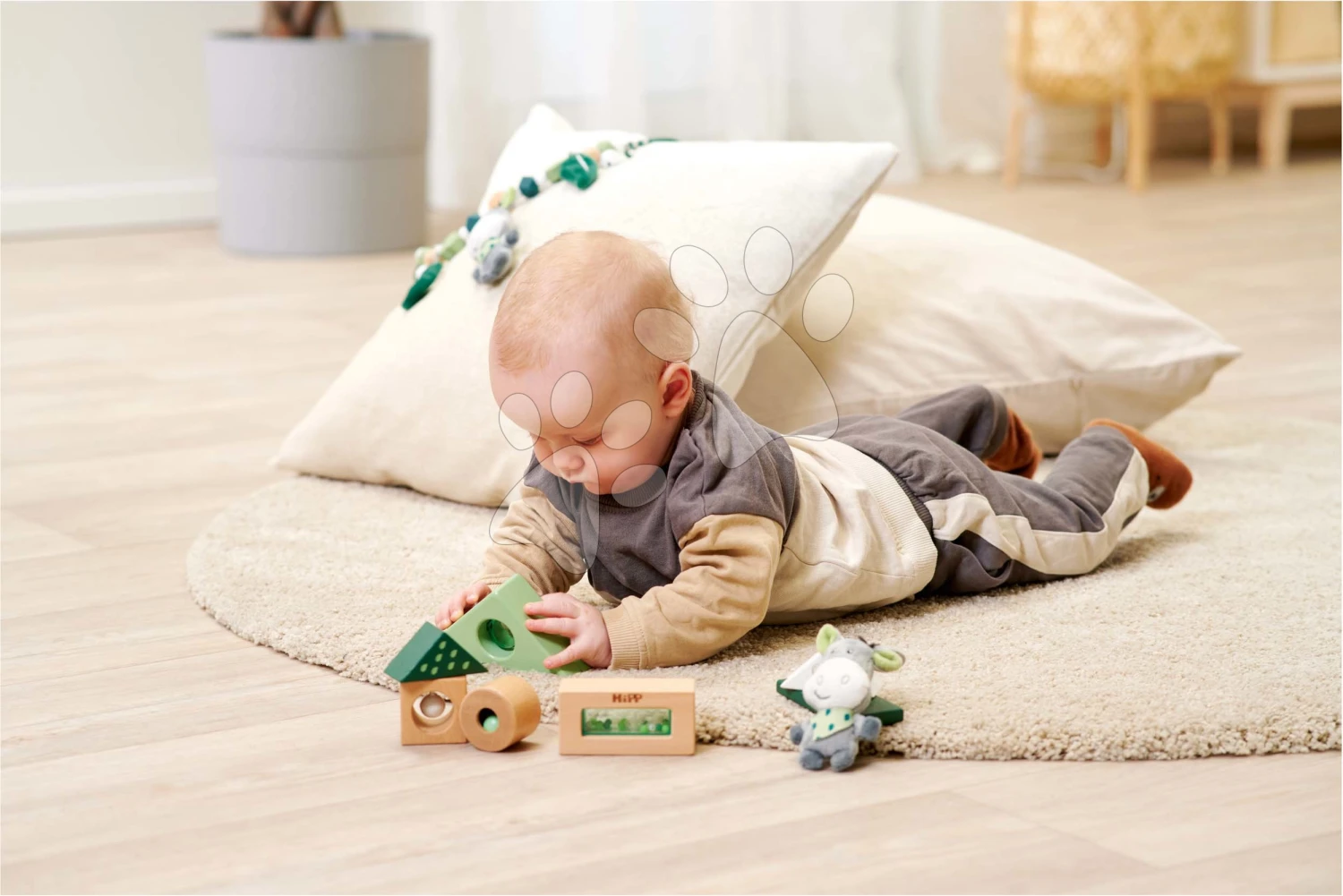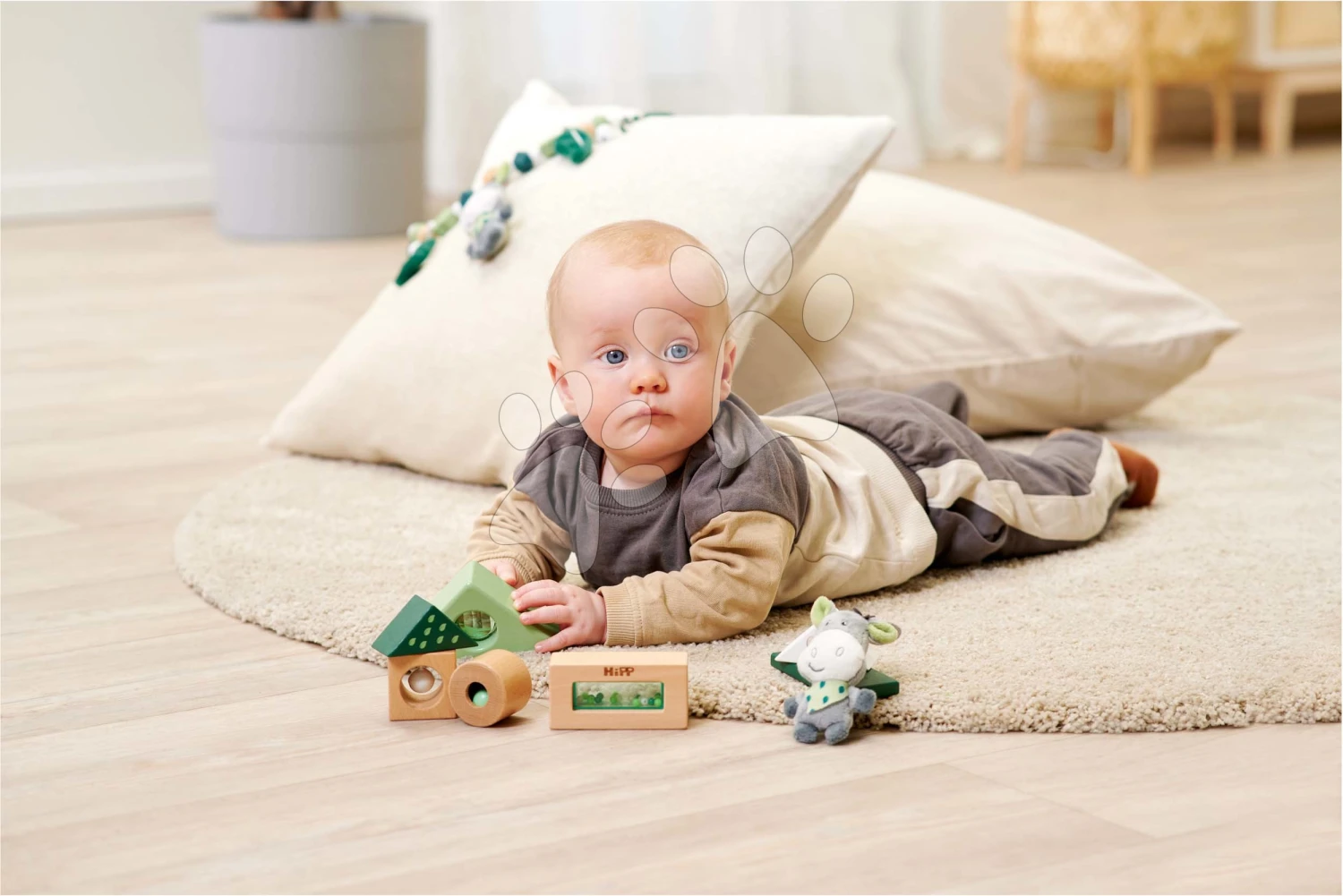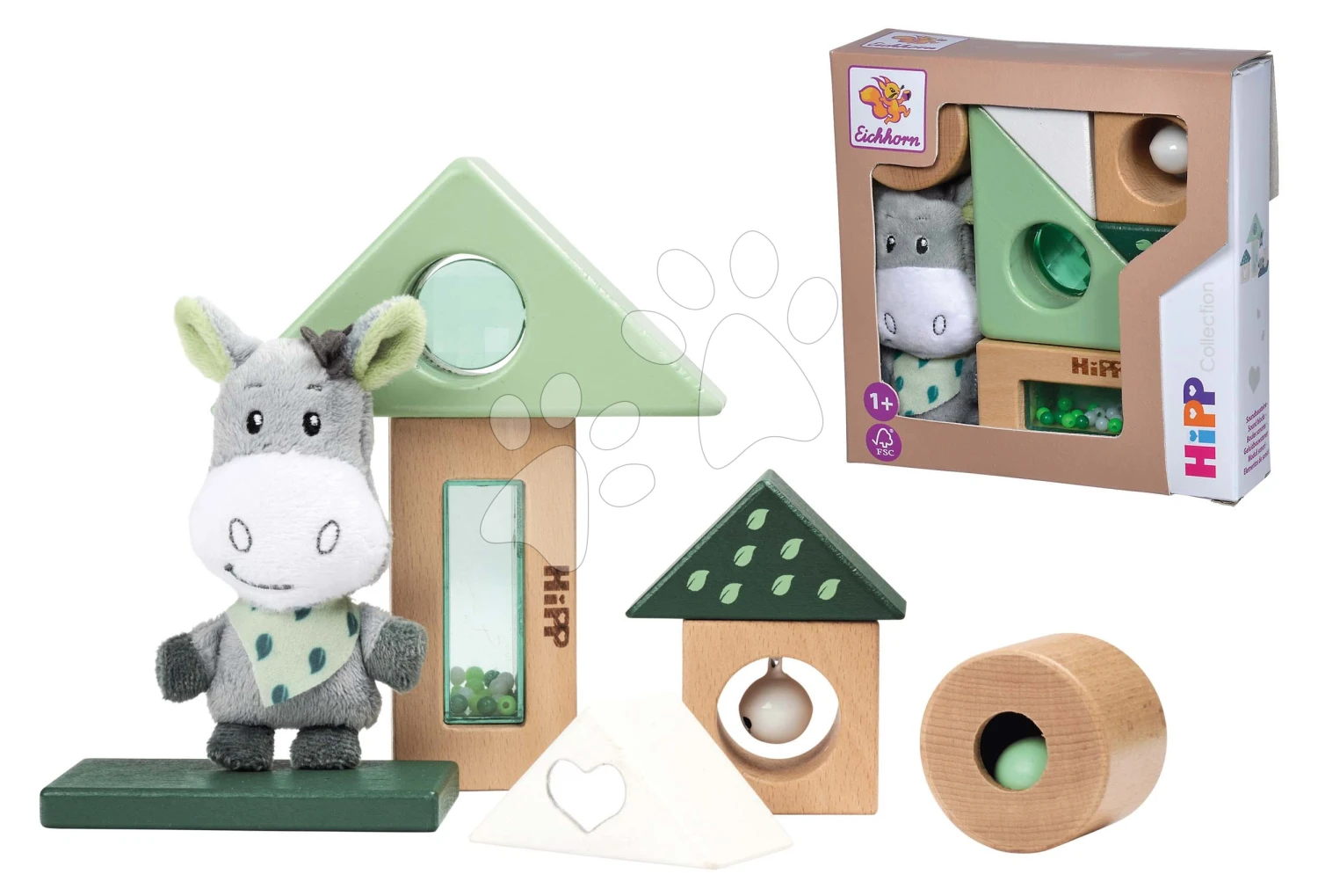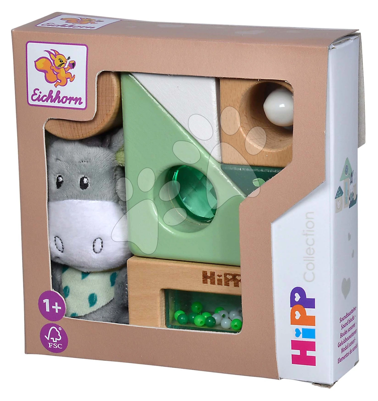Drevené Didaktické Kocky So Zvukom Baby HIPP Sound Blocks Eichhorn S Plyšovým Somárikom 8 Dielov Od 12 Mes EH5865