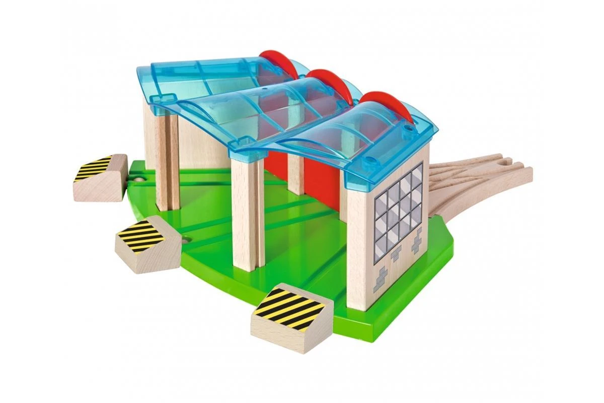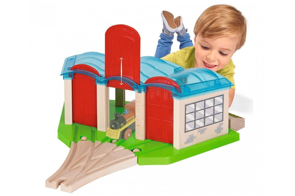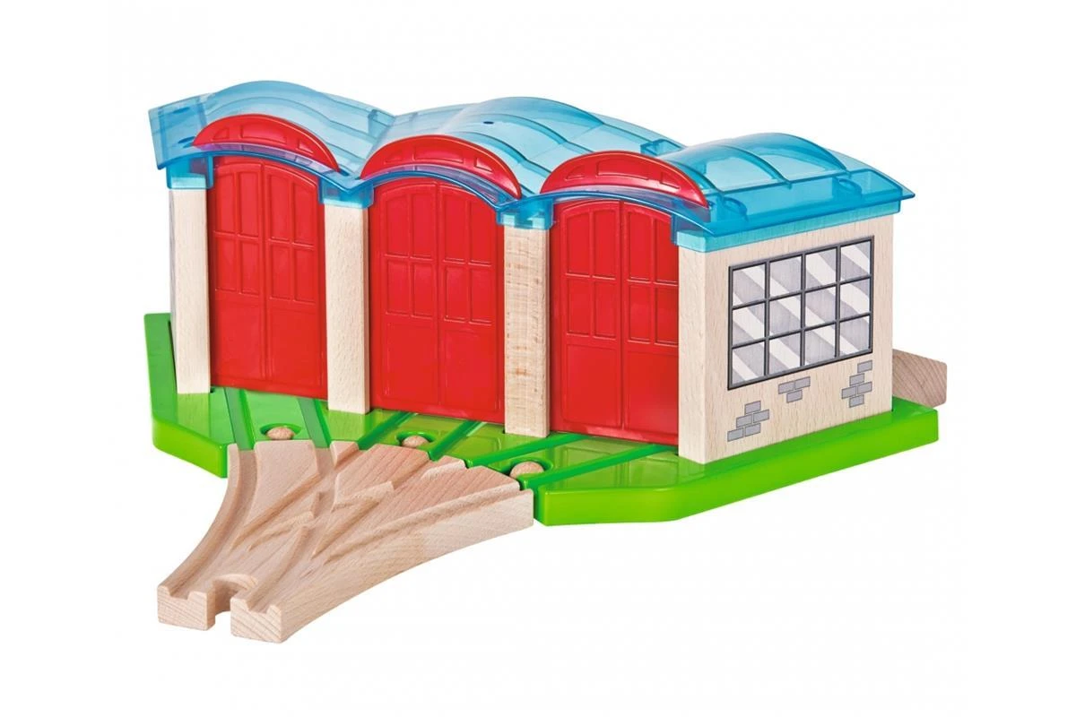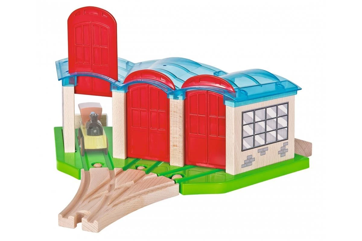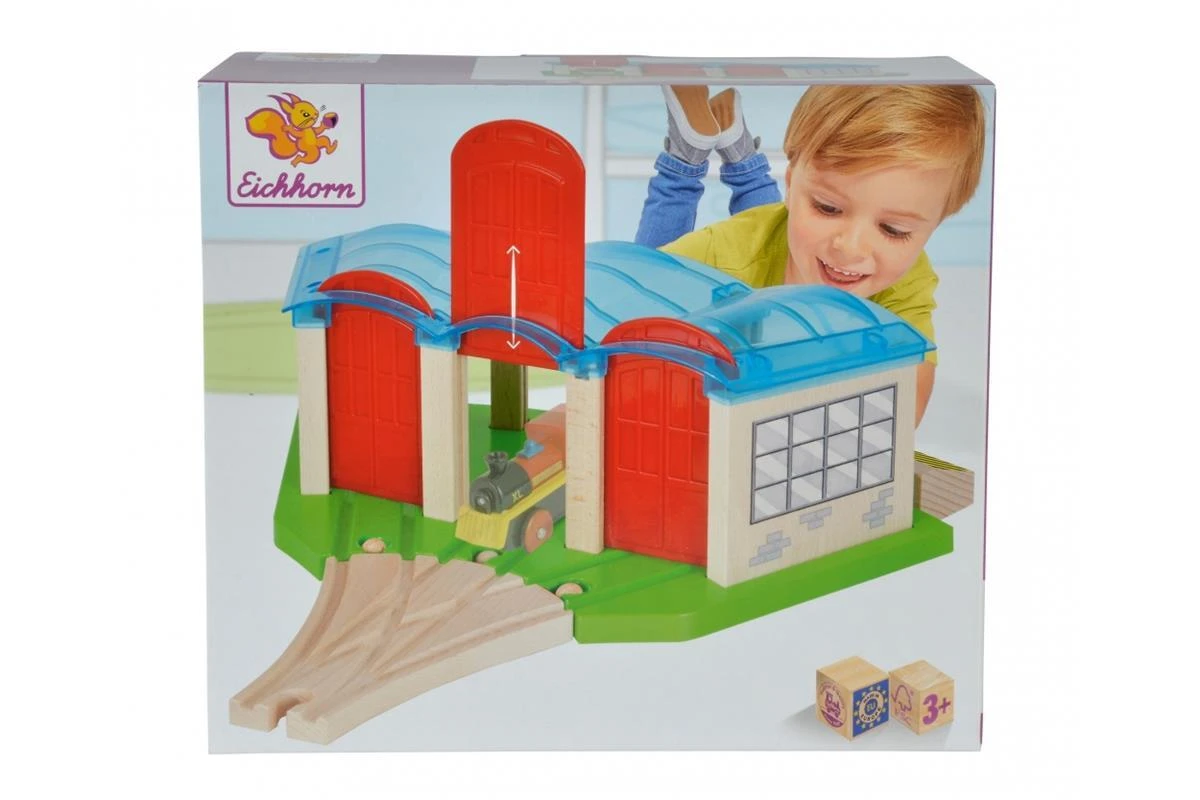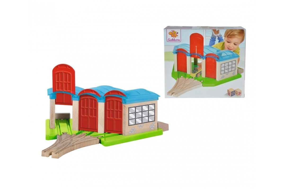 Eichhorn Bahn, Lokschuppen: In der Nacht werden alle Züge der Eichhorn Schienenbahn im tollen Lokschuppen von Eichhorn geparkt. Der Lokschuppen hat 3 Tore, eine Weiche und Schienen mit Prellböcken. Die Tore lasse sich einfach nach unten oder oben verstellen, sodass die Züge in oder durch den Lokschuppen fahren können. Für die Herstellung der Eichhorn Schienenbahn wird ausschließlich FSC® 100% Holz aus nachhaltiger Forstwirtschaft verwendet. Sie ist mit fast allen Schienenbahnen kombinierbar. Für Kinder ab 3 Jahren geeignet.