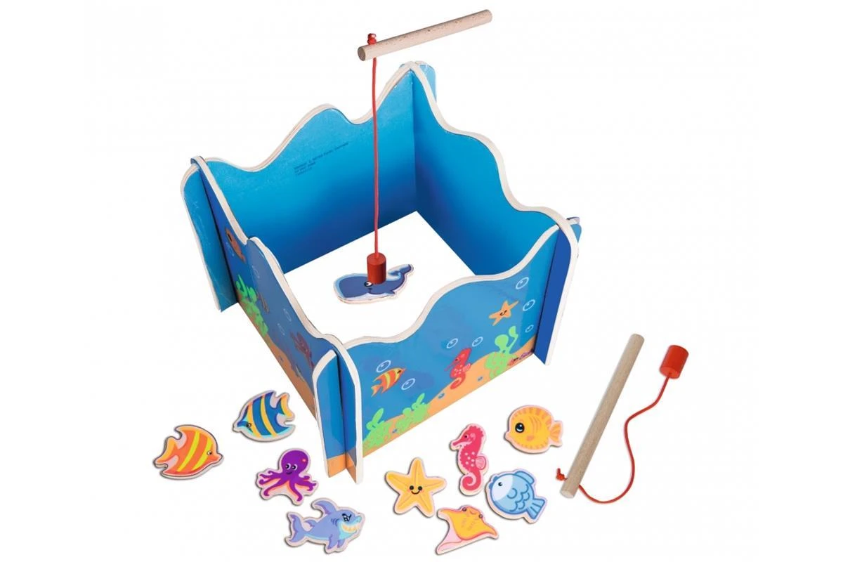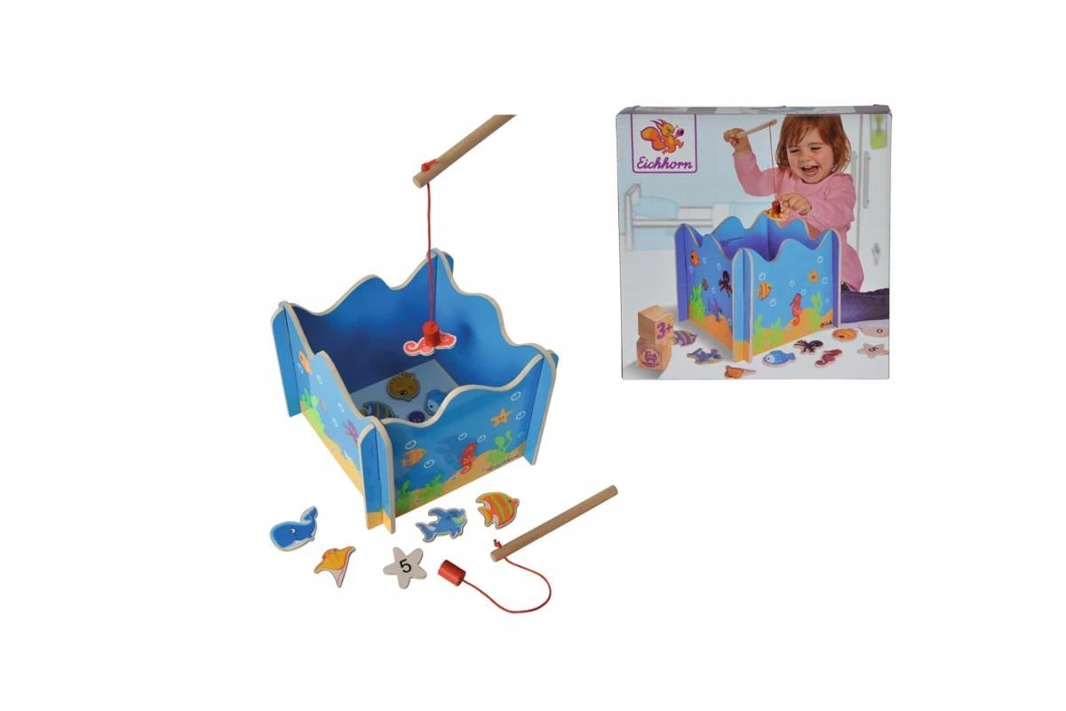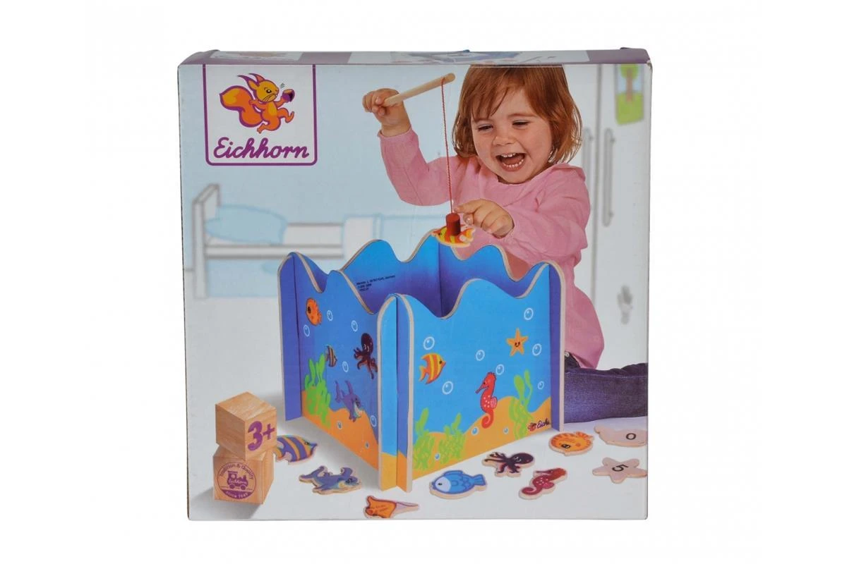 Eichhorn Angelspiel: Mit dem Eichhorn Angelspiel werden die tollsten Motive gefangen. An der Holzangel ist ein Magnet befestigt mit dem man die Fische und andere Meeresbewohner herausholen kann. Auf der Rückseite der Fische sind Zahlen aufgedruckt, jeder Spieler zählt seine Punkte zusammen, somit kann der Sieger des lustigen Spiels herausgefunden werden. Das Magnet-Angelspiel hat eine aufgebaute Gesamtgröße von 19x19x15cm und besteht aus 16 Teilen und ist für Kinder ab 3 Jahren geeignet.