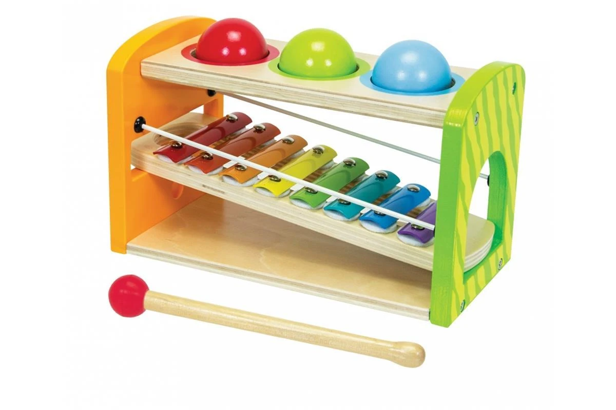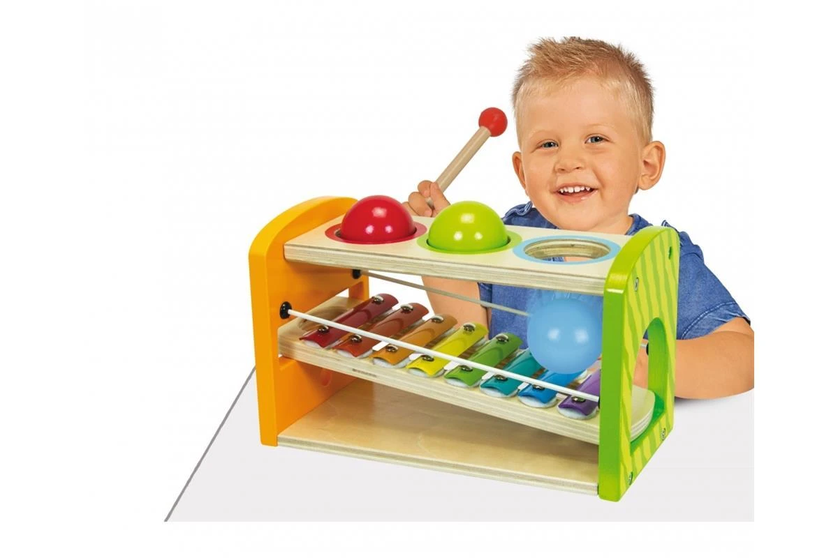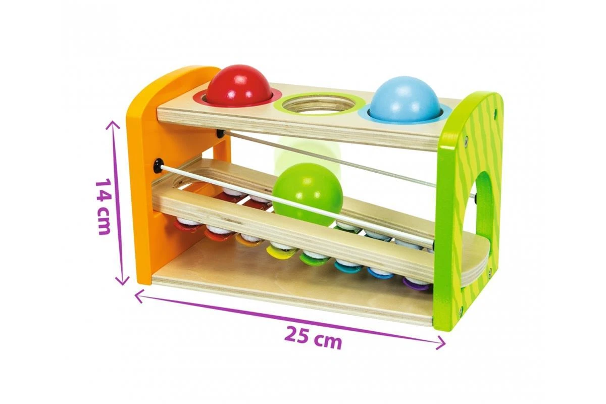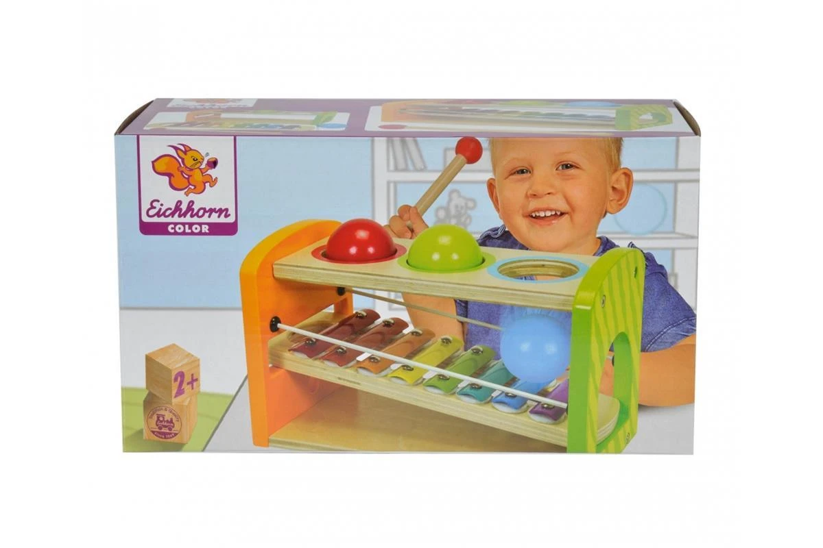 Eichhorn Color, Xylophon Klopfbank: Mit der Color Xylophon Klopfbank von Eichhorn können sich Kinder so richtig austoben. Es erfordert Geschick und jeder Treffer wird zum Erfolgserlebnis, wenn die bunten Kugeln durchgeklopft, über das Xylophon laufen und unten wieder herauskullern. Ein toller Spielspaß, der die Hand-Auge-Koordination und die Motorik fördert. Das Xylophon von Eichhorn erzeugt harmonische Töne und trägt zur positiven Entwicklung der auditiven Wahrnehmung des Kindes bei. Da sich die Kleinen die Reihenfolge einzelner Töne, die durch verschiedene Farben gekennzeichnet sind, merken müssen um wiedererkennbare Melodien spielen zu können. Das Xylophon kann entnommen und unabhängig von der Klopfbank bespielt werden. Im 5-tlg. Set ist die 12,5x25x12cm große Kugelklopfbank mit 3 bunten Löchern, 3 farbige Kugeln und ein Hammer enthalten. Für Kinder ab 2 Jahren geeignet.