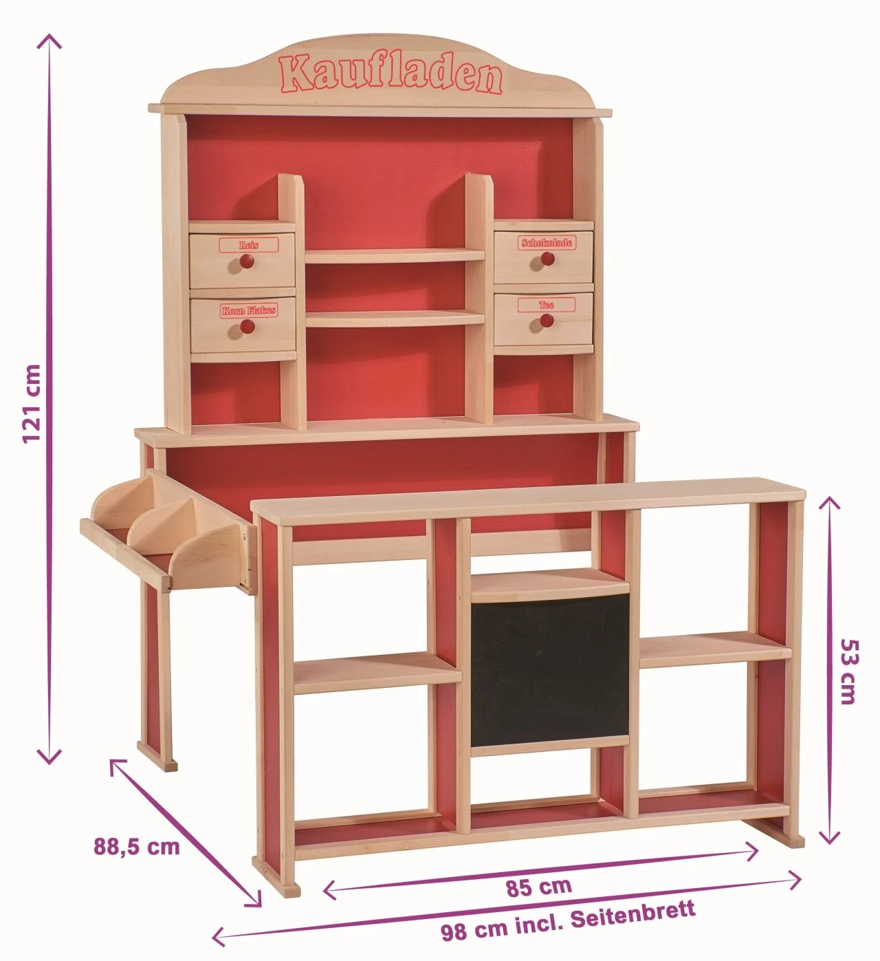 Der Kaufladen von Eichhorn bietet alles was das kleine Verkäuferherz begehrt: kleine Schubladen, Fronttheke, viele Ablageflächen, eine Tafel, auf der Tages- oder Sonderangebote notiert werden können. Der Shop hat aufgebaut eine Größe von 88,5x98x121cm. Einfache Selbstmontage nach Bauanleitung möglich. Ohne Zubehör. Für Kinder ab 3 Jahren geeignet.