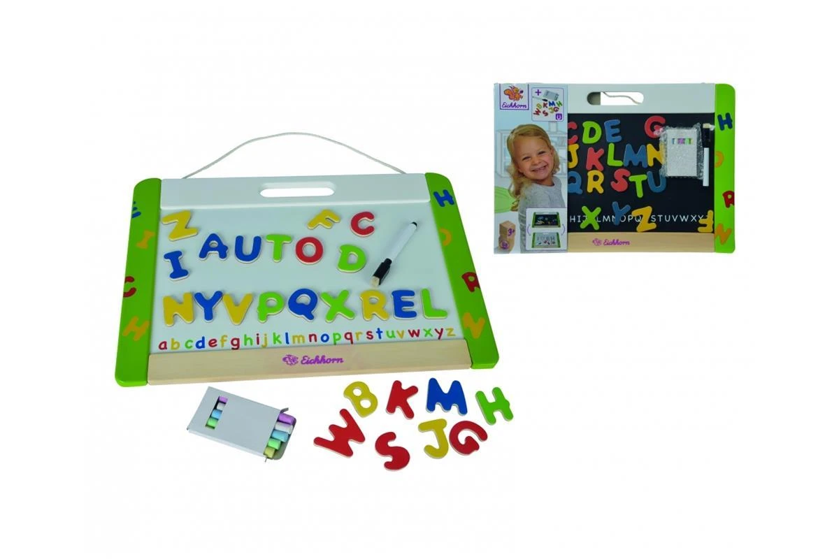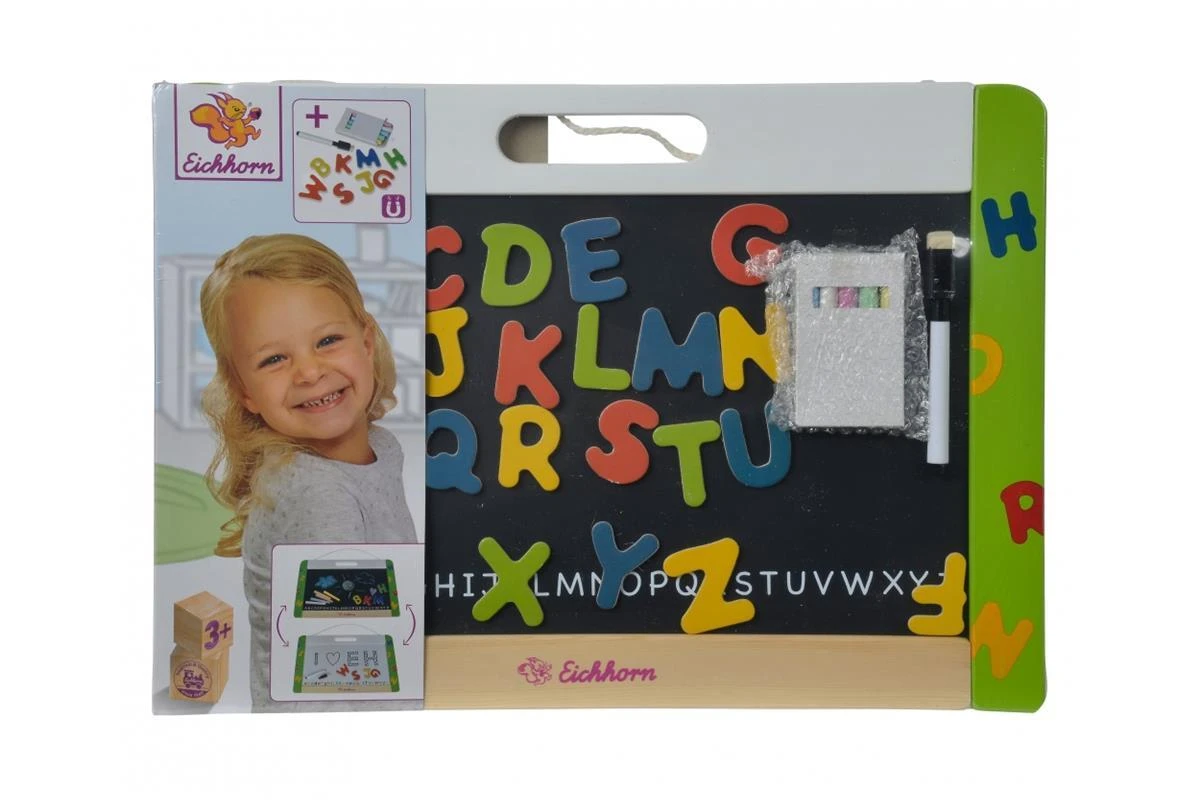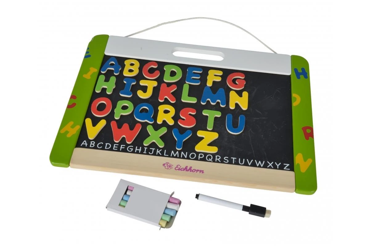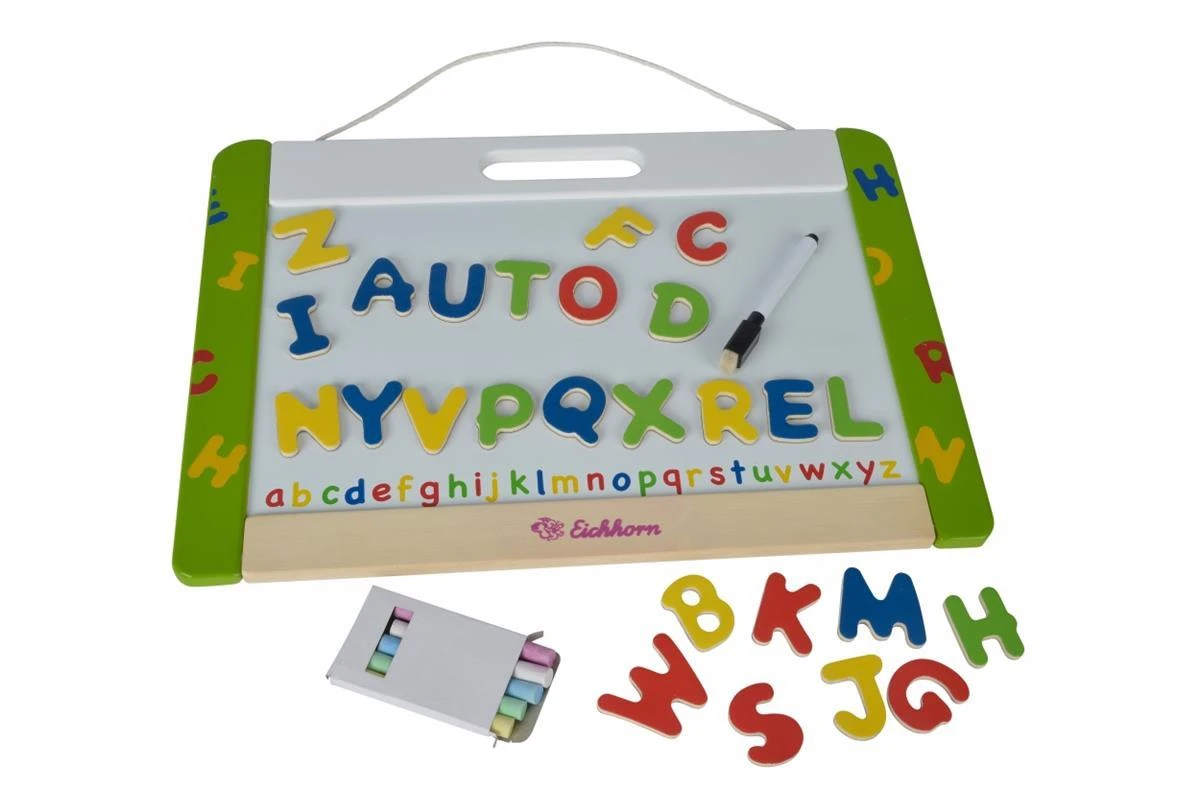 Eichhorn Hänge-Magnettafel: Die Hänge-Magnettafel von Eichhorn mit einer Größe von42x30cm fördert die Kreativität und die Motorik Ihres Kindes. Eine Seite der Tafel ist weiß, magnetisch und für Folienstifte geeignet, die andere Seite ist ebenfalls magnetisch und für Kreiden geeignet. Die Tafel aus hochwertigem Holz kann mit einer Schnur an der Wand befestigt werden. Im Set sind 26 Magnetbuchstaben aus Holz, 5 Kreiden und ein Folienstift enthalten. Für Kinder ab 3 Jahren geeignet.