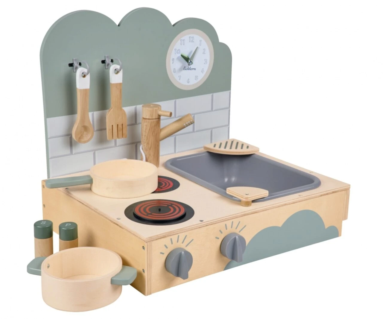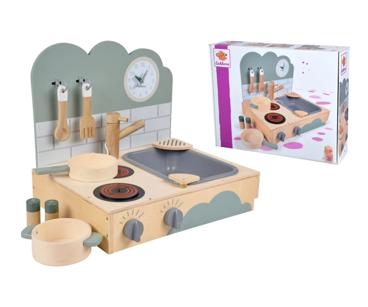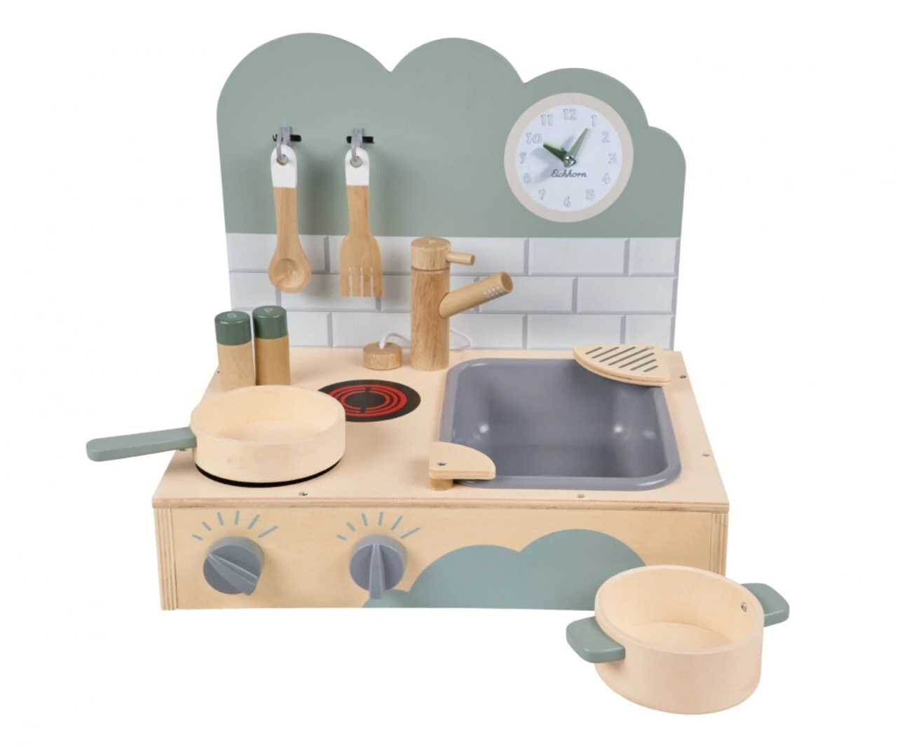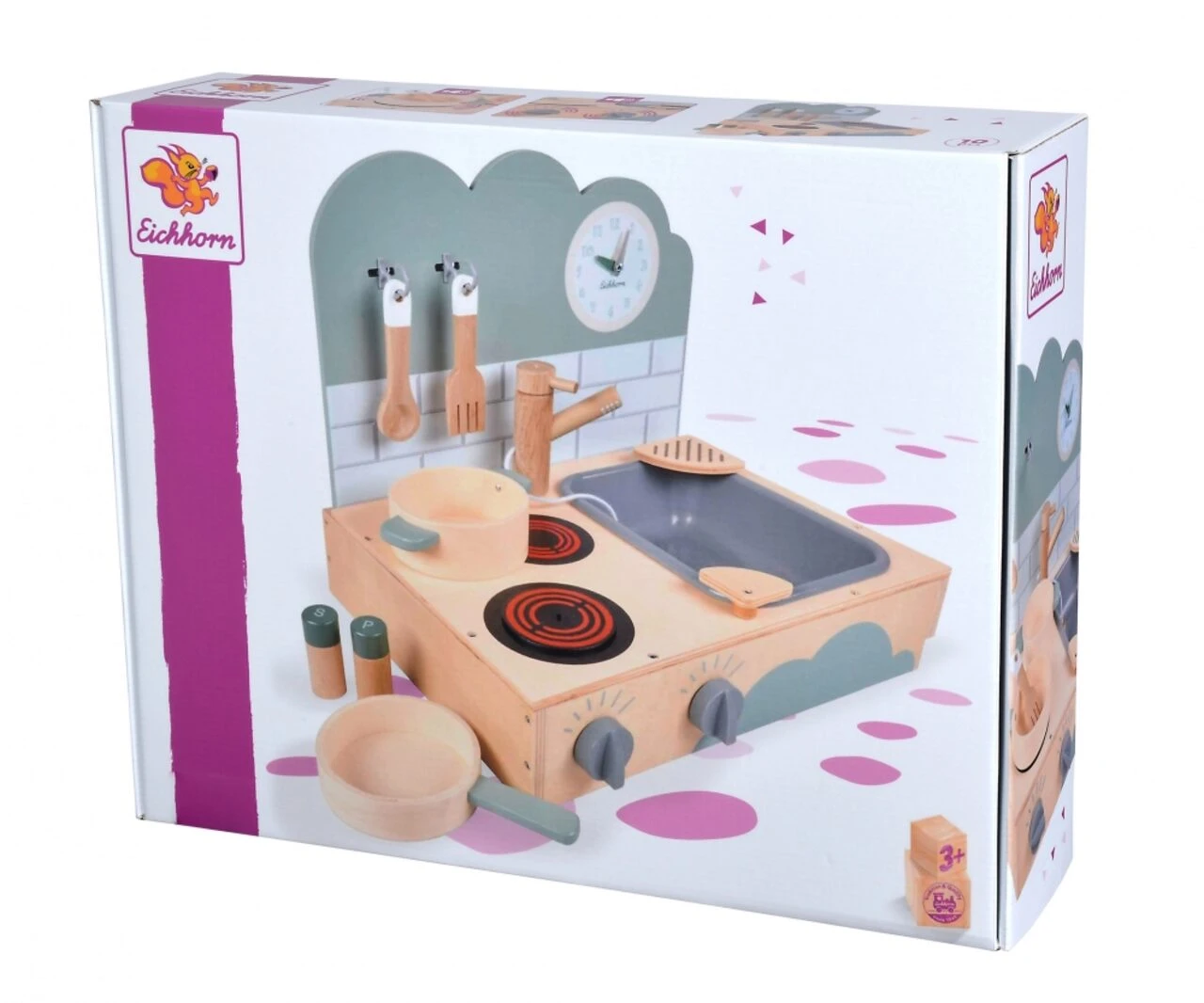 Eichhorn Kleine Tischküche: Die kleine Tischküche bietet mit einem Kochfeld mit Sound und entsprechenden Dreh-Knöpfen mit Klack Funktion, einer Pfanne und einem Topf, einem Spülbecken mit Wasserhahn, Kochlöffel und Pfannenwender, Salz- und Pfefferstreuer, und einer verstellbaren Uhr, alles was kleine Köche oder Köchinnen benötigen. Aufgebaut hat die Spielküche eine Größe von 40 x 35 x 31 cm.