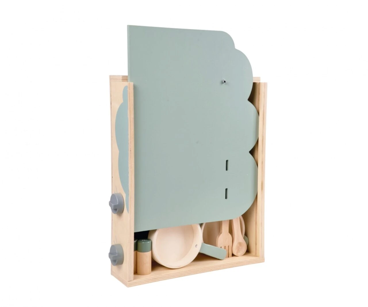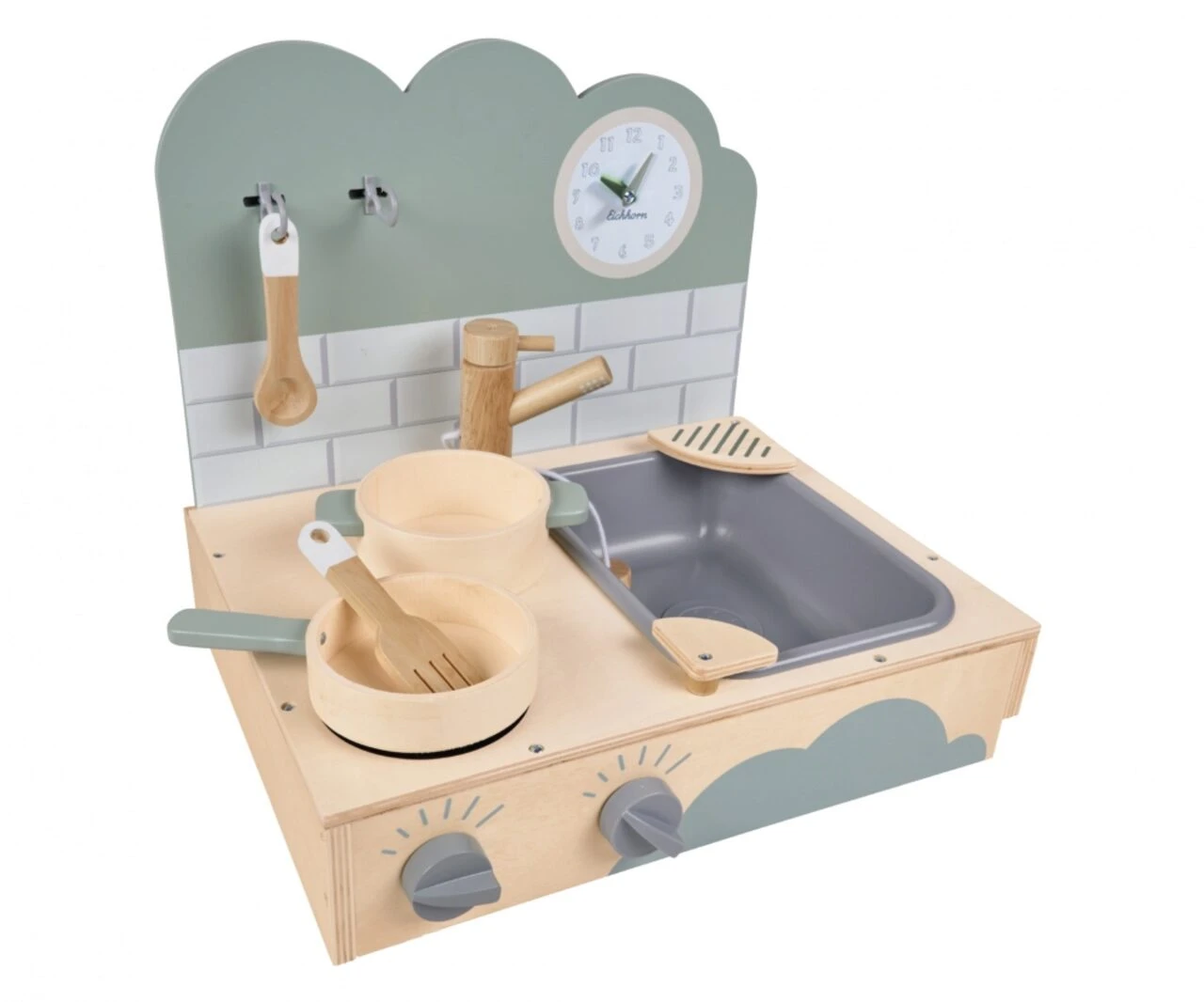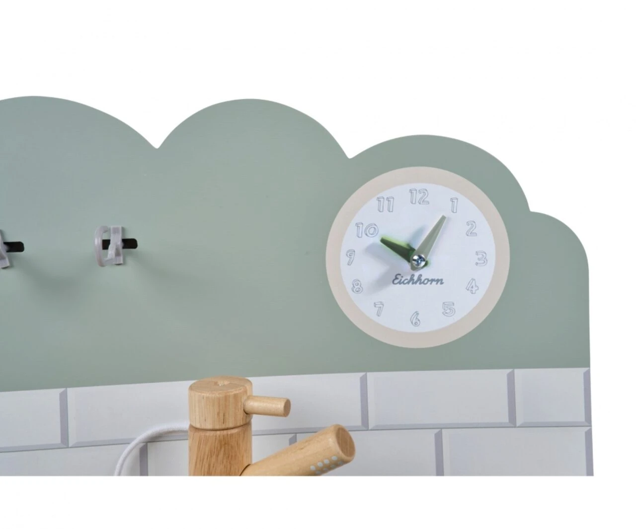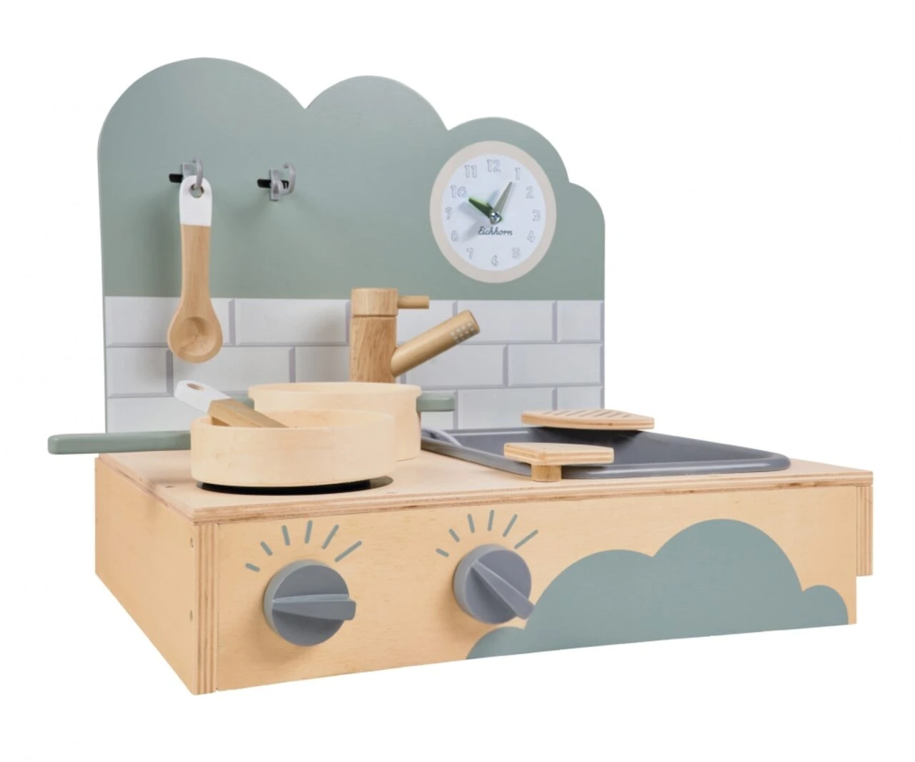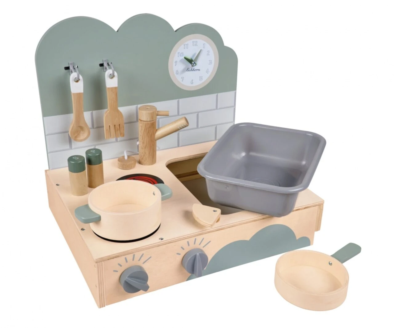Eichhorn Kleine Tischküche: Die kleine Tischküche bietet mit einem Kochfeld mit Sound und entsprechenden Dreh-Knöpfen mit Klack Funktion, einer Pfanne und einem Topf, einem Spülbecken mit Wasserhahn, Kochlöffel und Pfannenwender, Salz- und Pfefferstreuer, und einer verstellbaren Uhr, alles was kleine Köche oder Köchinnen benötigen. Aufgebaut hat die Spielküche eine Größe von 40 x 35 x 31 cm.