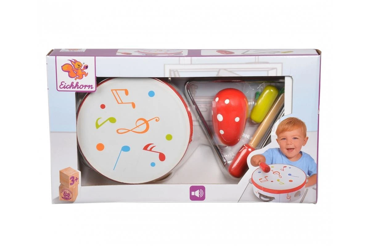 Mit dem Eichhorn Musik Set werden Kinder mit einer Trommel, einer Triangel und einem Maraca-Ei musikalisch aktiv. Jedes der Instrumente ist bunt lackiert und macht tolle Geräusche. Die Trommel und die Triangel enthalten die jeweils dafür vorgesehenen Schläger. Für Kinder ab einem Jahr geeignet.