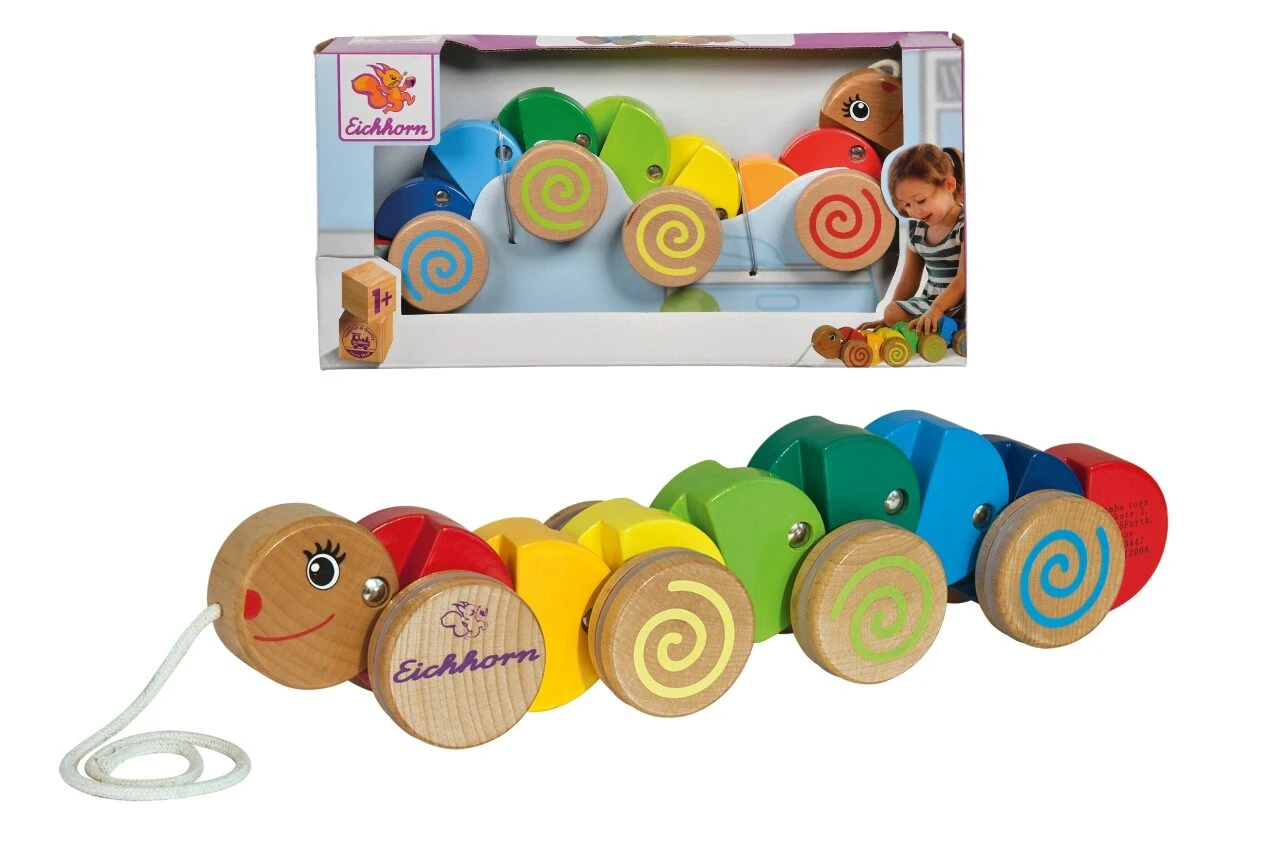 Die 32cm lange Nachziehraupe von Eichhorn folgt kleinen Lauflernern auf Schritt und Tritt. Warme Farben und ein fröhliches Gesicht machen die Raupe zu einem liebenswerten Begleiter für Zuhause und unterwegs. Die Raupe animiert die Kleinen sich zu Bewegen und fördert so ihre Mobilität. Vor allem die wellenartigen Bewegungen der Raupe sorgen beim Hinterherziehen stets für Unterhaltung. Kinder ab einem Jahr werden es lieben, das Nachzieh-Spielzeug aus Buchholz an der Nase rumzuführen.