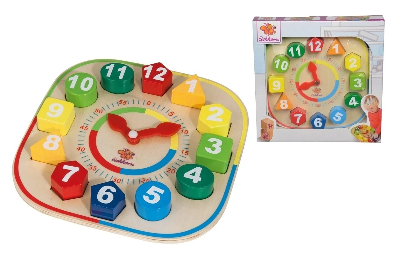 Die 25×25 cm große Spieluhr von Eichhorn macht die Kinder spielerisch mit der Zeit vertraut.