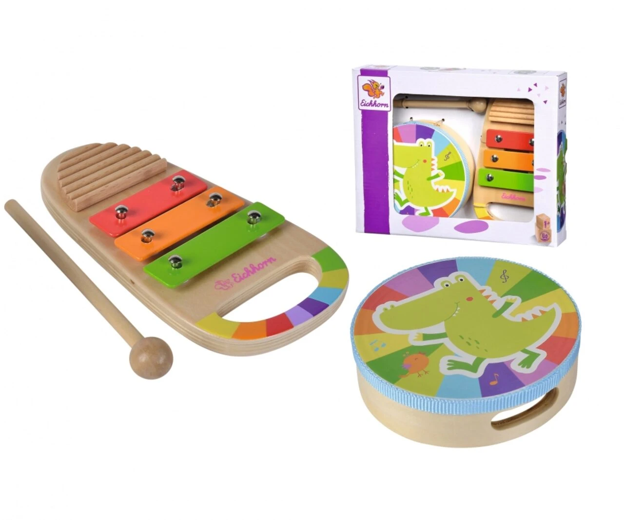 Eichhorn Musik Set, Trommel und Xylophon: Mit dem Eichhorn Musik Set, bestehend aus einem Xylophon mit Ratsche und einer Trommel werden Kinder musikalisch aktiv. Die zwei Instrumente bestehen aus hochwertigem Birkenholz, sind kunterbunt gestaltet und machen tolle Geräusche. Für Kinder ab einem Jahr geeignet.
