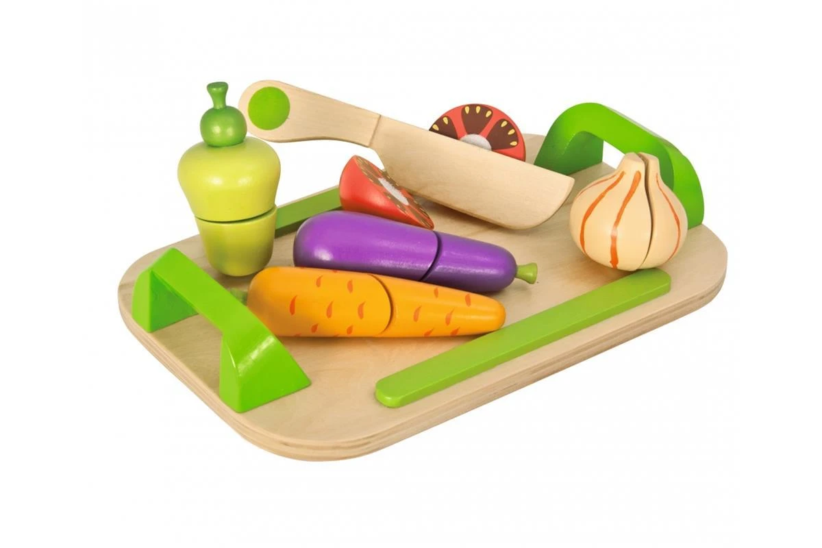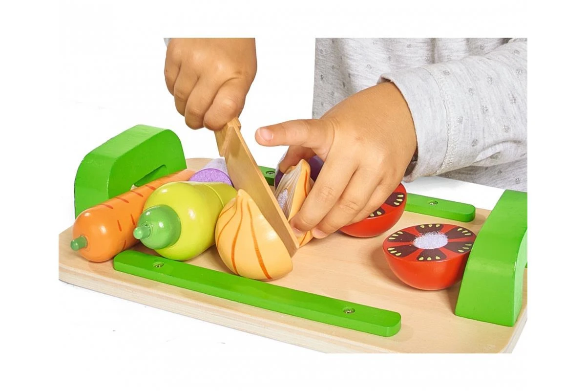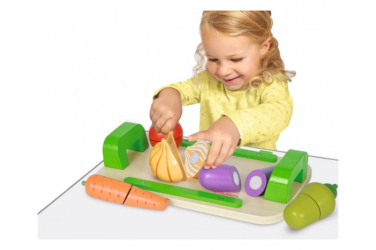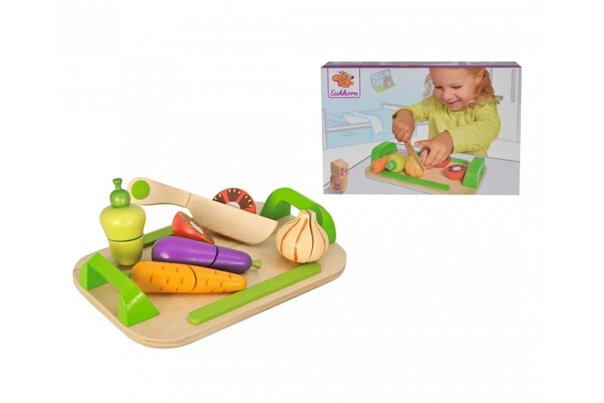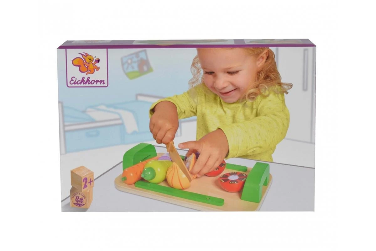 Mit dem Eichhorn Schneidebrett können die Kleinen die ersten Versuche unternehmen Gemüse zu schneiden. Jedes Gemüse besteht aus zwei Teilen, die mit einem Klettverschluss verbunden sind. Mit dem messer wird die Verbindung gelöst und es entstehen zwei Teile.