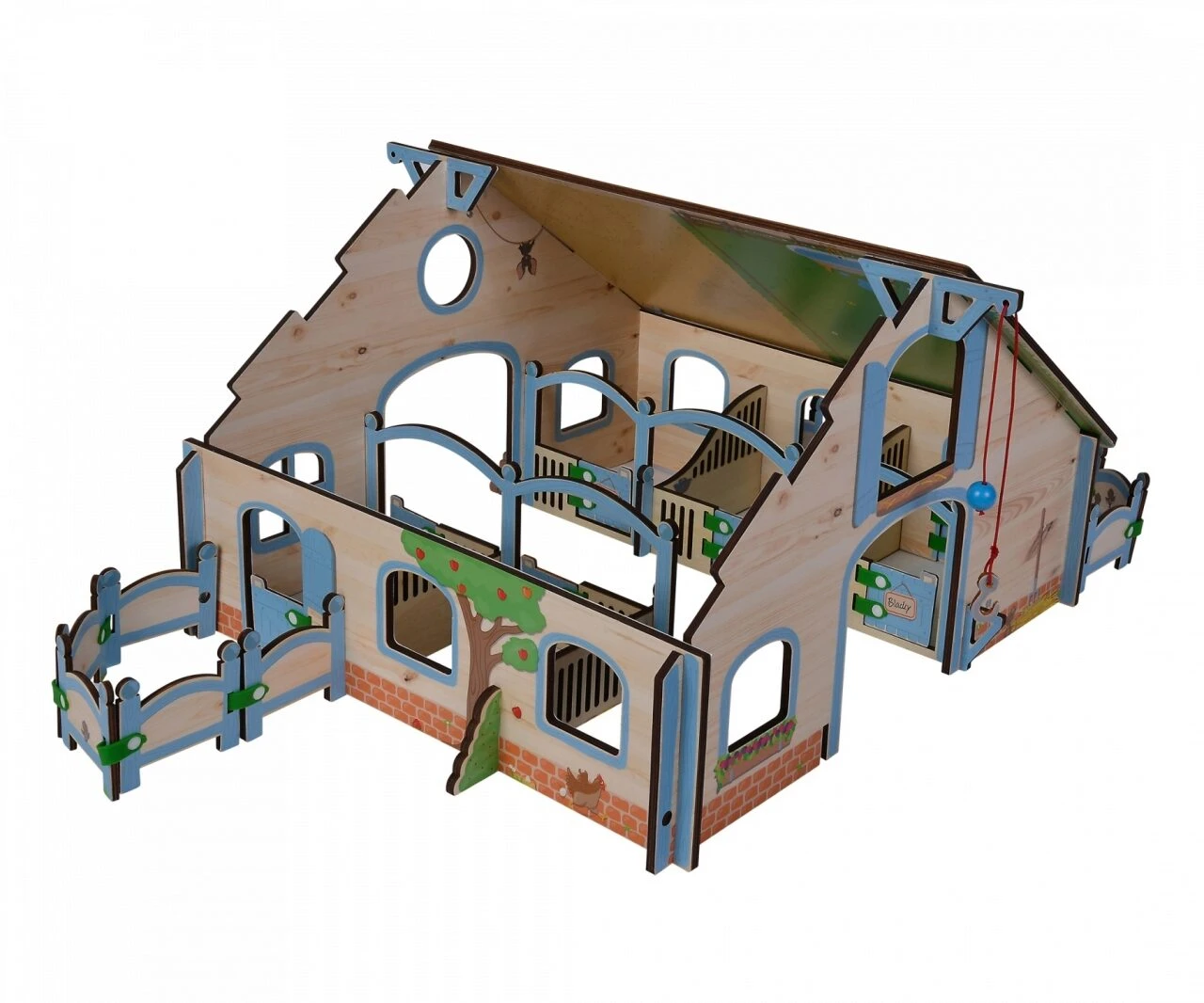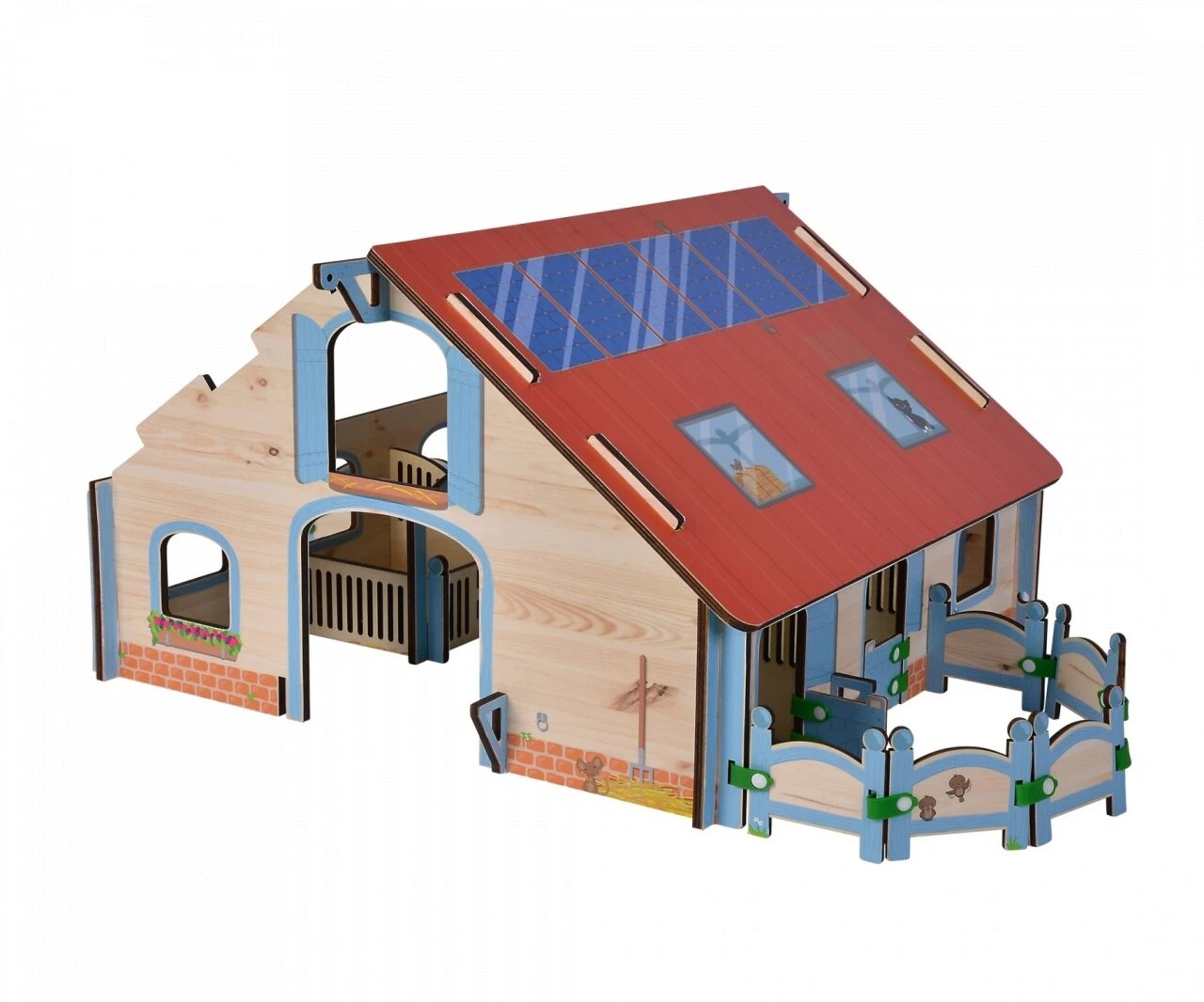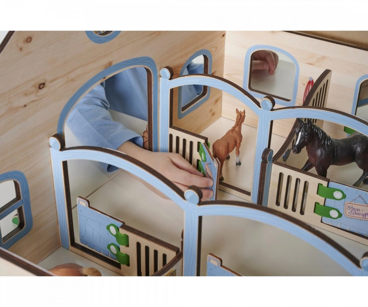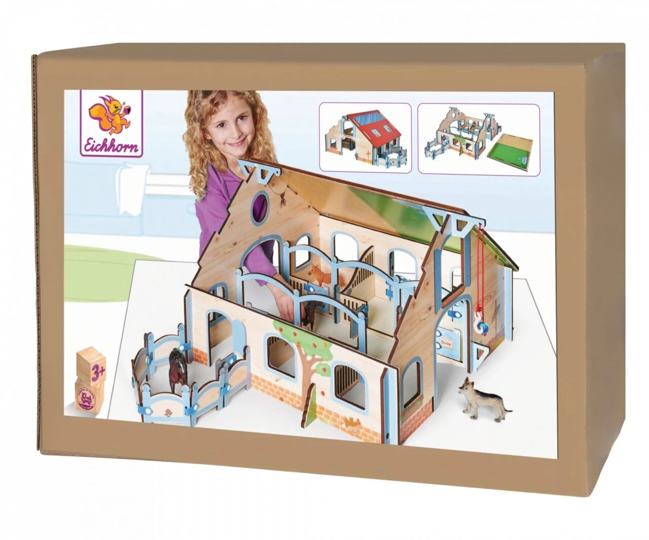 In dem Eichhorn Pferdestall ist immer etwas los. Der 30-teilige Pferdestall ist 57x52x35cm groß und ist für 6-12cm große Pferde, sowie für handelsübliche Traktoren und Tiere, geeignet. Das Gebäude hat fünf Pferdeboxen mit beweglichen Boxentüren und mehrere Gatter, die ganz einfach zu unterschiedlich großen Paddocks zusammen gebaut werden können. Das Dach ist abnehmbar und kann bespielt werden. Der Eichhorn Pferdestall wird in unmontiertem Zustand geliefert. Für Kinder ab 3 Jahren geeignet.