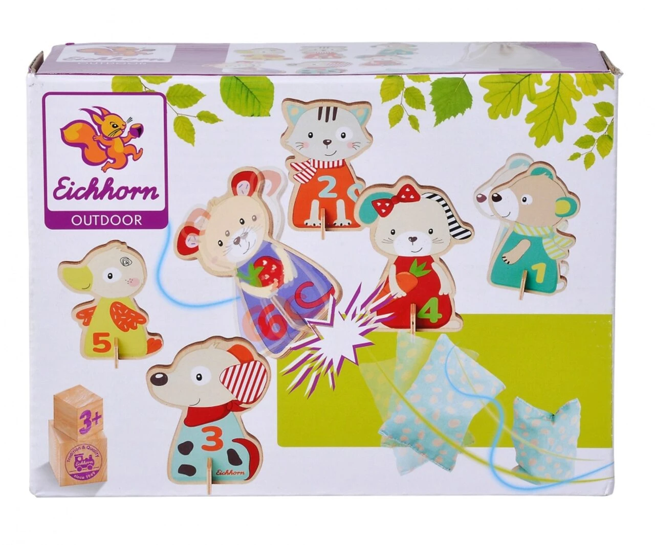 Eichhorn Outdoor Säckchen Wurfspiel: Das lustige Wurfspiel besteht aus 6 verschiedenen niedlichen Spielfiguren aus Lindensperrholz und 3 Wurfsäckchen. Die kleinen bunten Tierchen sind mit unterschiedlichen Punktezahlen gekennzeichnet, und stehen durch die enthaltenen und jeweils zugehörigen Steckstützen perfekt auf jedem Untergrund. Mit Hilfe der Wurfsäckchen können die Tierfiguren umgeworfen werden. Im beigelegten Beutel können alle Teile problemlos einfach verstaut, aufbewahrt, und überall hin mitgenommen werden. Das Spiel ist geeignet für Kinder ab 3 Jahren.