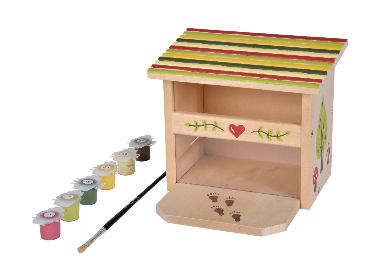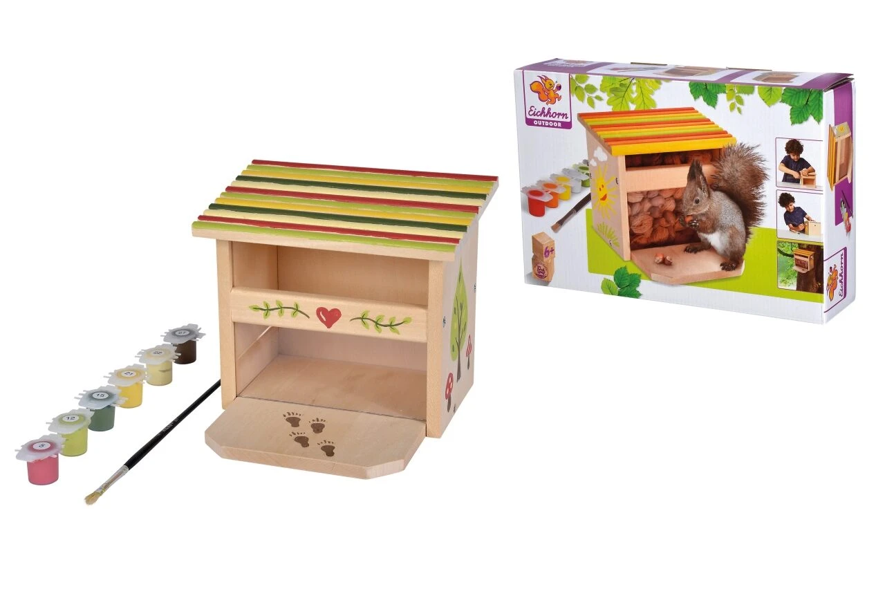 Mit dem Futterhaus von Eichhorn kann man Eichhörnchen eine Freude bereiten. Das Futterhaus ist 17x18x15cm groß und mit Hilfe der Anleitung schnell zusammengebaut. Dazu sind im Set passende Schrauben enthalten. Anschließend kann es mit den 6 beigefügten Farben und dem Pinsel kunterbunt nach Lust und Laune angemalt werden. Mit der mitgelieferten Schnur lässt sich das Futterhaus am Baum aufhängen oder mit der integrierten Vorrichtung an der Rückseite des Hauses am Baum befestigen. Danach nur noch mit Futter befüllen und auf die Eichhörnchen warten. Das Haus wird aus hochwertigem Lindenholz gefertigt und ist für Kinder ab 6 Jahren geeignet.