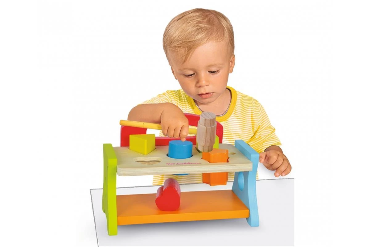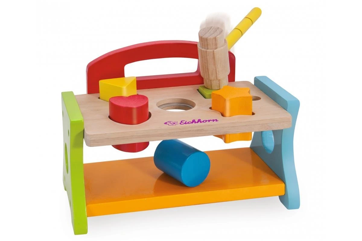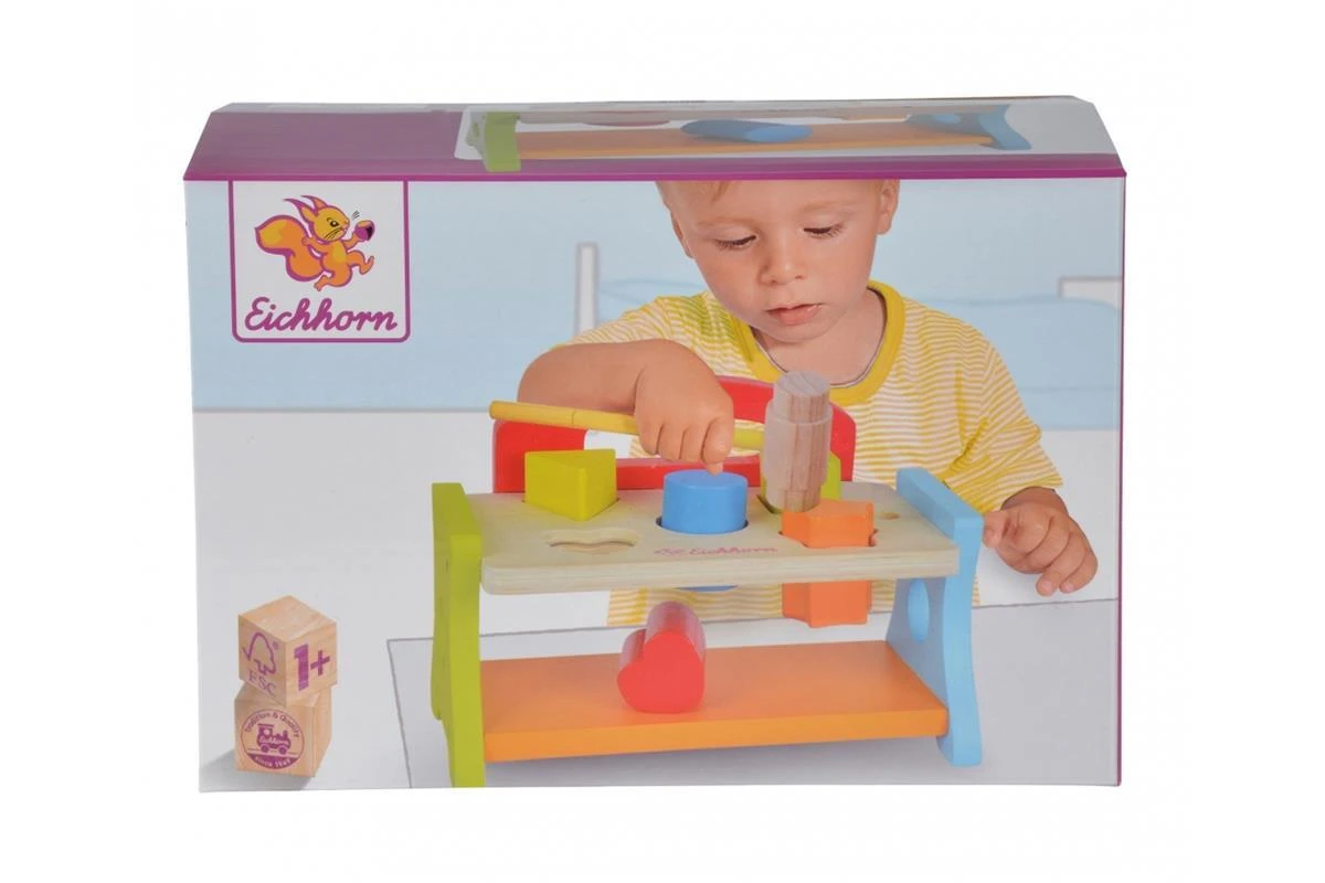 Fördern Sie mit der Eichhorn Hammerbank den Lernprozess für die Wahrnehmung von Farben und Formen der Kleinen und sehen Sie wie sich ihre motorischen Fähigkeiten entwickeln bzw. verbessern. Mit dem Hammer können die einzelnen Formen durch die jeweiligen Löcher in die Bank gehämmert werden. Mit der Hammerbank dürfen angehende Handwerker sich gerne austoben. Für die Herstellung der Eichhorn Hammerbank wird ausschließlich FSC® 100% Holz aus nachhaltiger Forstwirtschaft verwendet. Für Kinder ab einem Jahr geeignet.
