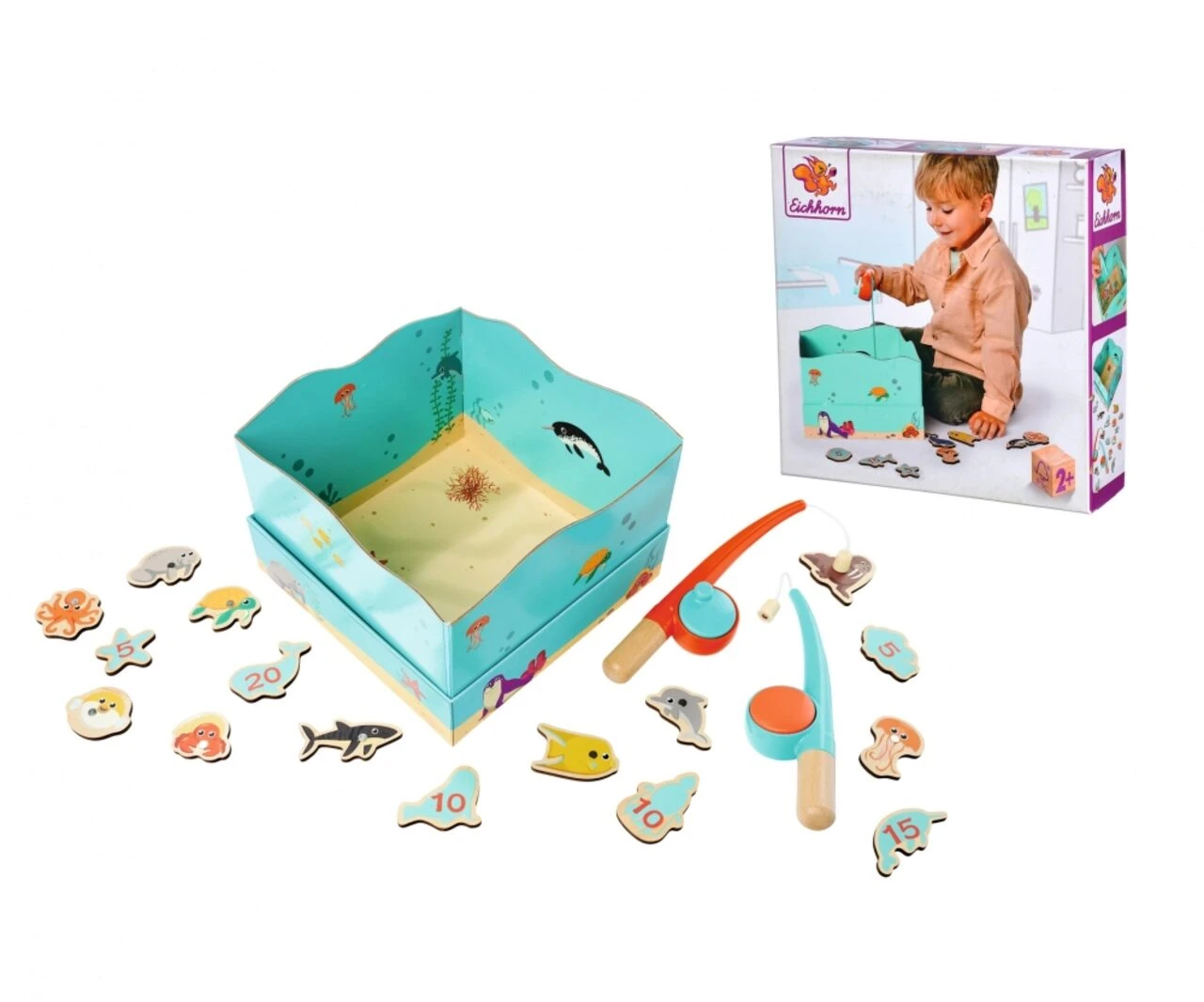 Eichhorn Angelspiel: Mit dem Eichhorn Angelspiel werden die tollsten Motive gefangen. An den beiden Angeln sind Magnete befestigt mit dem man die Fische und andere Meeresbewohner herausholen kann. Auf der Rückseite der Fische sind Zahlen aufgedruckt, jeder Spieler zählt seine Punkte zusammen, somit kann der Sieger des lustigen Spiels herausgefunden werden. Das Magnet-Angelspiel besteht aus 19 Teilen und ist für Kinder ab 2 Jahren geeignet.
