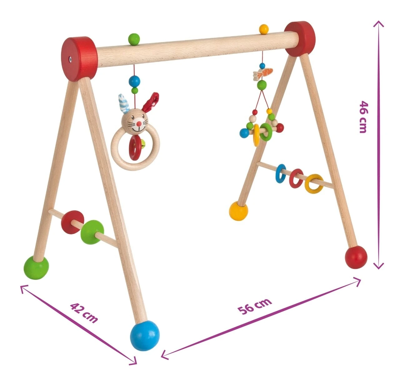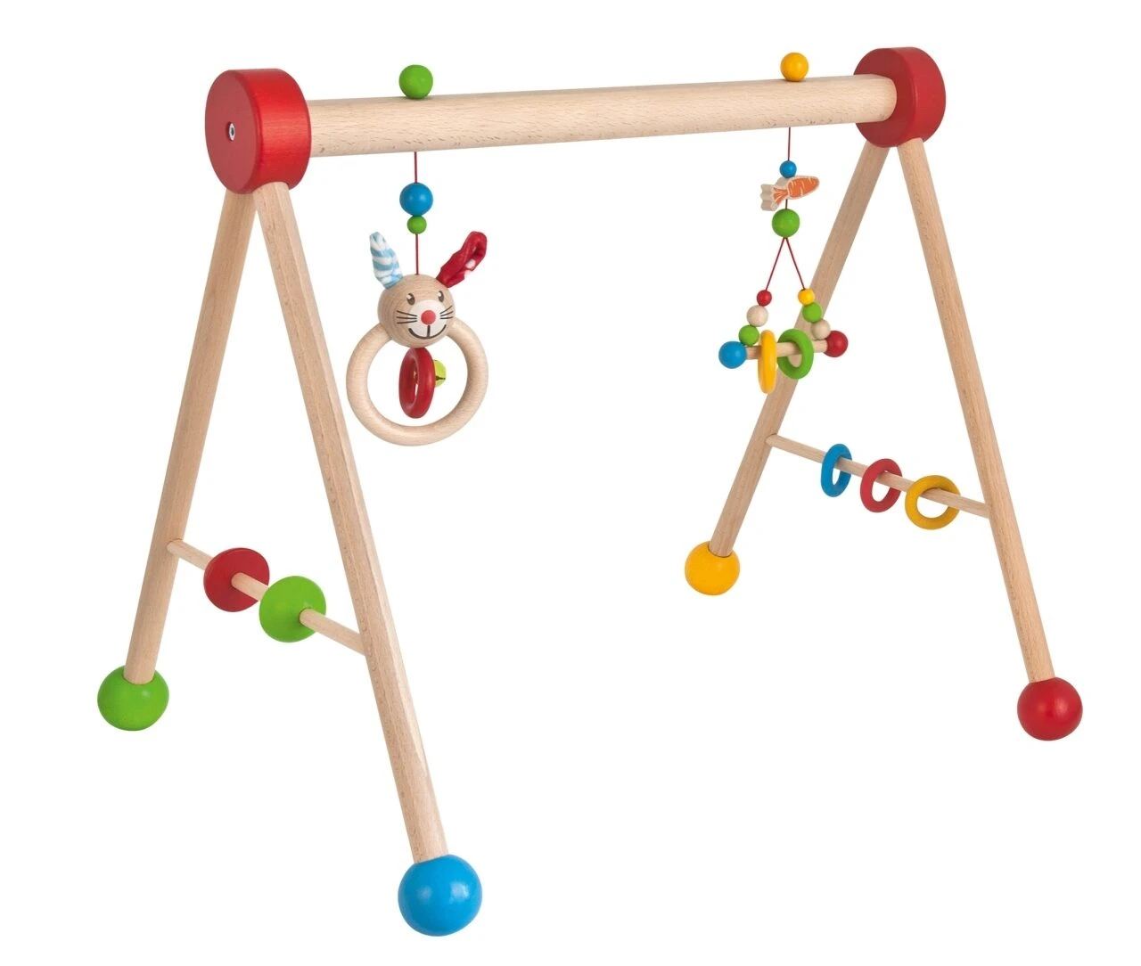 Eichhorn Baby Gym: Mit dem farbenfrohen Baby Gym von Eichhorn und seinen Spielaktivitäten und Geräuschen wird gezieltes Greifen, Geschick,Reaktion und Konzentration trainiert. Am Baby Gym sind zwei Spielzeuge zum Greifen aufgehängt, jedes mit einer anderen spannenden Funktion: ein kleines Glöckchen, verschiedene Materialien und das kleine süße Hasenköpfchen mit Plüschohren. An den Seiten sind Elemente zum Drehen und Beißringe aus Gummi für kleine Babys zum Spielen befestigt. Für die Herstellung des Eichhorn Baby Gym wird ausschließlich FSC® 100% Holz aus nachhaltiger Forstwirtschaft verwendet. Für Kinder ab 3 Monaten geeignet.