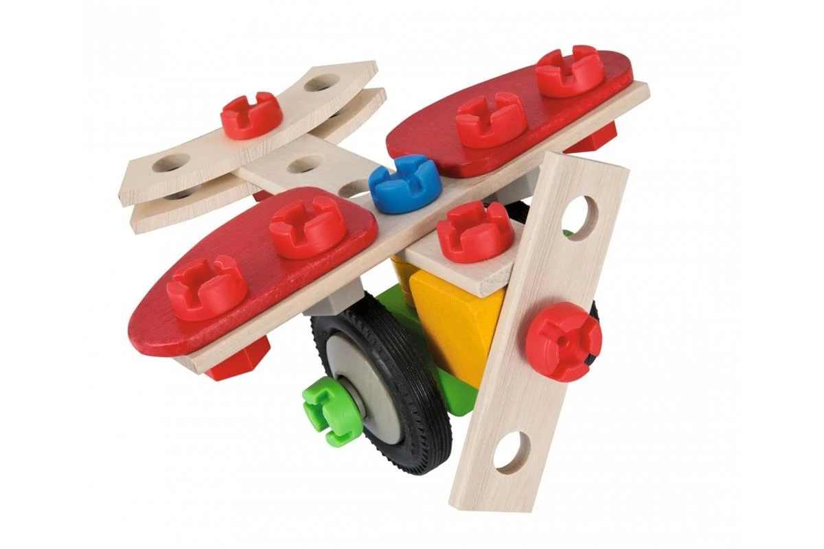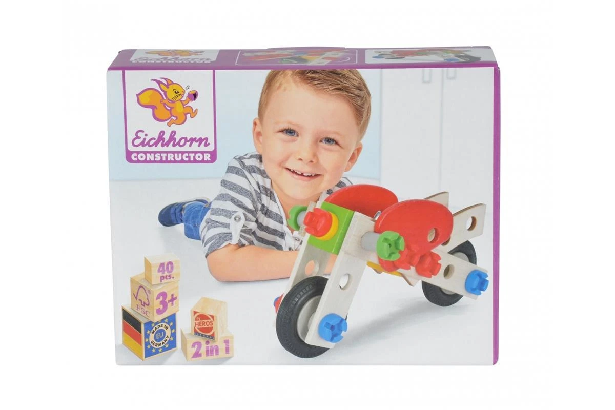 Eichhorn Constructor, Motorrad: Aus dem 40-teiligen Eichhorn Constructor Set kann ein Motorrad oder ein Flugzeug zusammengeschraubt werden. Mit Hilfe der mitgelieferten Werkzeuge, der Anleitung und den Schrauben werden die 40 Holzteile und Verbindungselemente miteinander fixiert und eines der beiden Fahrzeuge entsteht. Natürlich sind der Fantasie keine Grenzen gesetzt und es können auch andere Figuren gebaut werden. Das Zusammenfügen fördert und schult das räumliche Denken und die Feinmotorik. Für Kinder ab 3 Jahren geeignet. Für die Herstellung der Eichhorn Artikel wird ausschließlich FSC® 100% Holz aus nachhaltiger Forstwirtschaft verwendet.