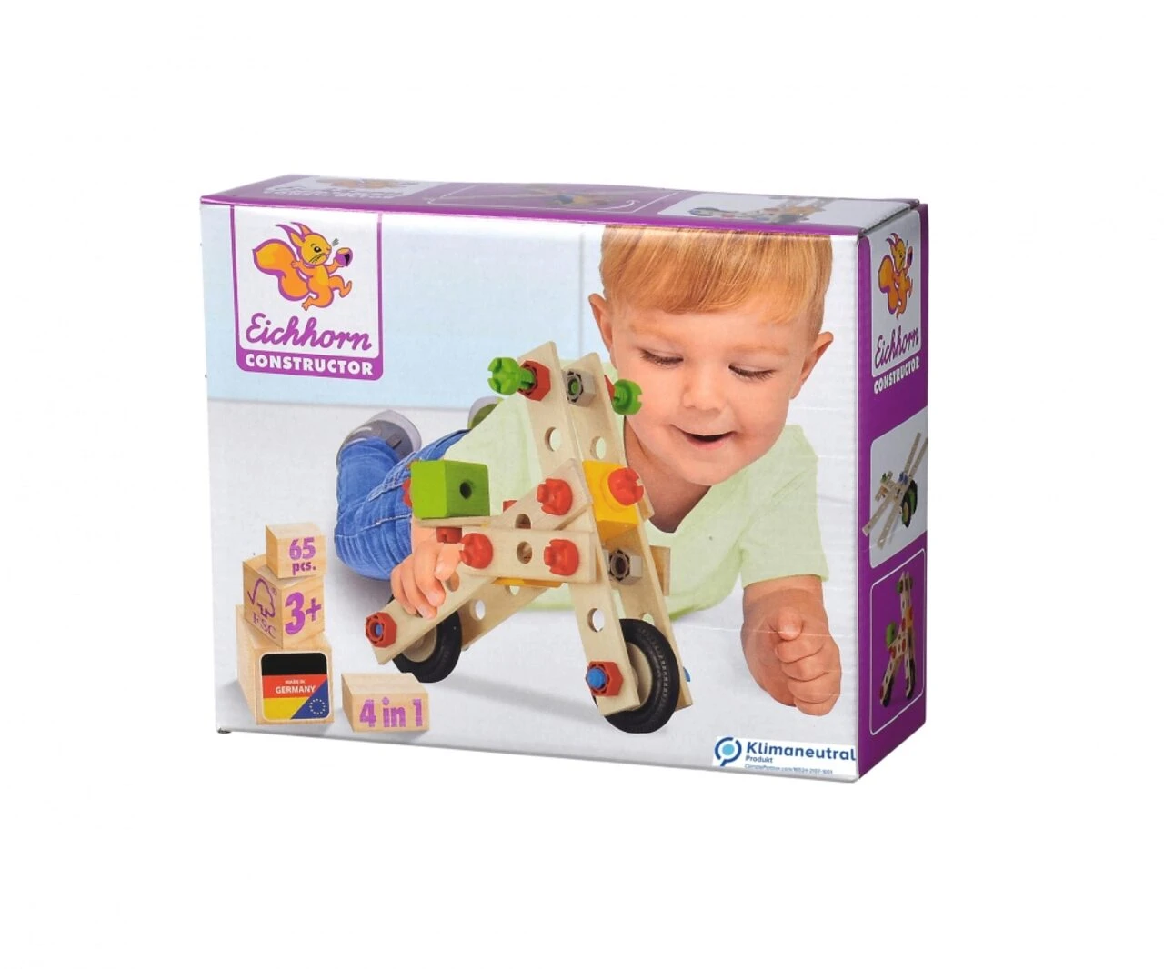 Eichhorn Constructor, Motorroller: Aus dem 65-teiligen Eichhorn Constructor Set können mit der Anleitung ganze vier verschiedene Fahrzeug-Modelle zusammengeschraubt werden. Ein Motorrad, Flugzeug, Miniroller oder eine Minilibelle. Mit Hilfe der mitgelieferten Werkzeuge, der Anleitung und den Schrauben werden die Holzteile und Verbindungselemente miteinander fixiert und die Modelle entstehen. Natürlich können mit Fantasie auch eigene tolle Modelle gebaut werden. Das Zusammenfügen fördert und schult das räumliche Denken und die Feinmotorik. Für die Herstellung der Eichhorn Contructor Modelle wird ausschließlich FSC® 100% Holz aus vorbildlicher Forstwirtschaft verwendet. Für Kinder ab 3 Jahren geeignet. Dieser Eichhorn Artikel ist Made in Germany. Der Artikel ist klimaneutral.