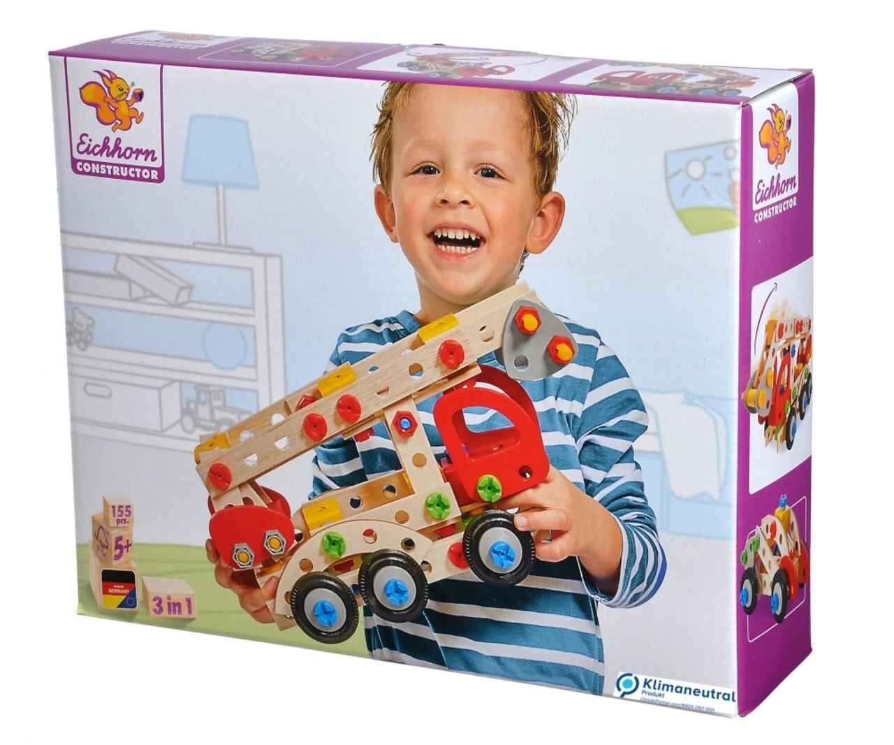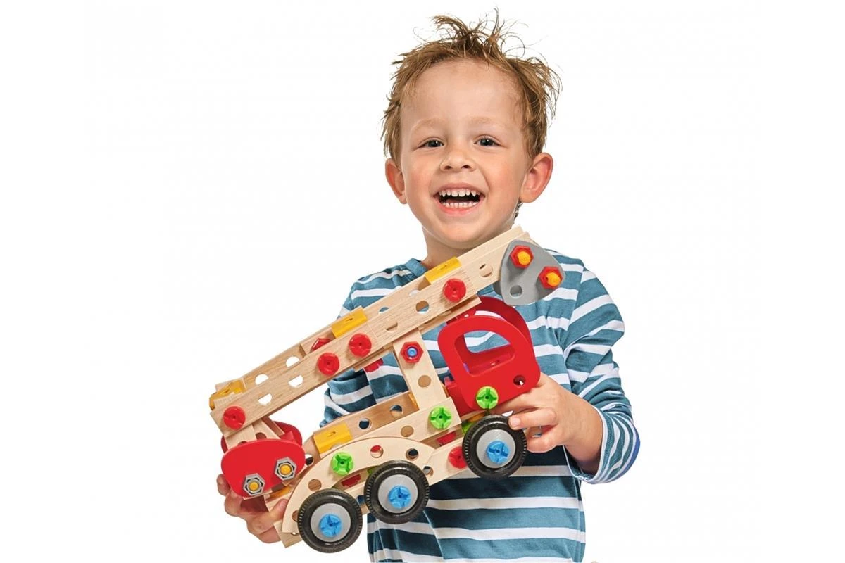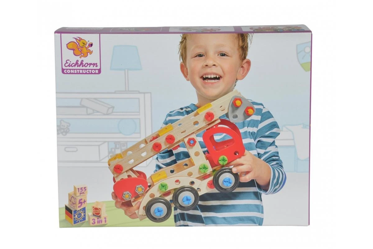 Eichhorn Constructor Feuerwehrauto: Baue dir aus dem 155-teiligen Eichhorn CONSTRUCTOR Set ein tolles Modell. Mit Hilfe der mitgelieferten Werkzeuge, der Anleitung und den Schrauben werden die 155 Holzteile und Verbindungselemente miteinander fixiert und das Modell entsteht. Das Zusammenfügen fördert und schult das räumliche Denken und die Feinmotorik. Die Modellvarianten bei diesem Set: Feuerwehrauto, Krankenwagen und Polizeiauto. Für die Herstellung des Eichhorn Constructor Set Feuerwehrauto wird ausschließlich FSC® 100% Holz aus nachhaltiger Forstwirtschaft verwendet. Für Kinder ab 5 Jahren geeignet.