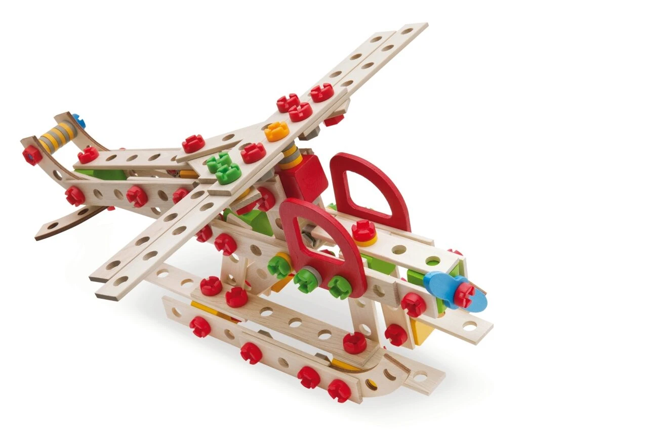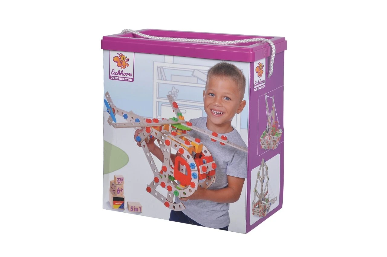 Eichhorn Constructor 225-tlg.: Aus dem 225-teiligen Eichhorn CONSTRUCTOR Set können fünf Modelle zusammengeschraubt werden: ein Hubschrauber, Kampfjet, Schiff, Trawler oder ein Wasserflugzeug. Mit Hilfe der mitgelieferten Werkzeuge, der Anleitung und den Schrauben werden die 225 Holzteile und Verbindungselemente miteinander fixiert und das Modell entsteht. Das Zusammenfügen fördert und schult das räumliche Denken und die Feinmotorik. Für die Herstellung der Eichhorn Constructor Modelle wird ausschließlich