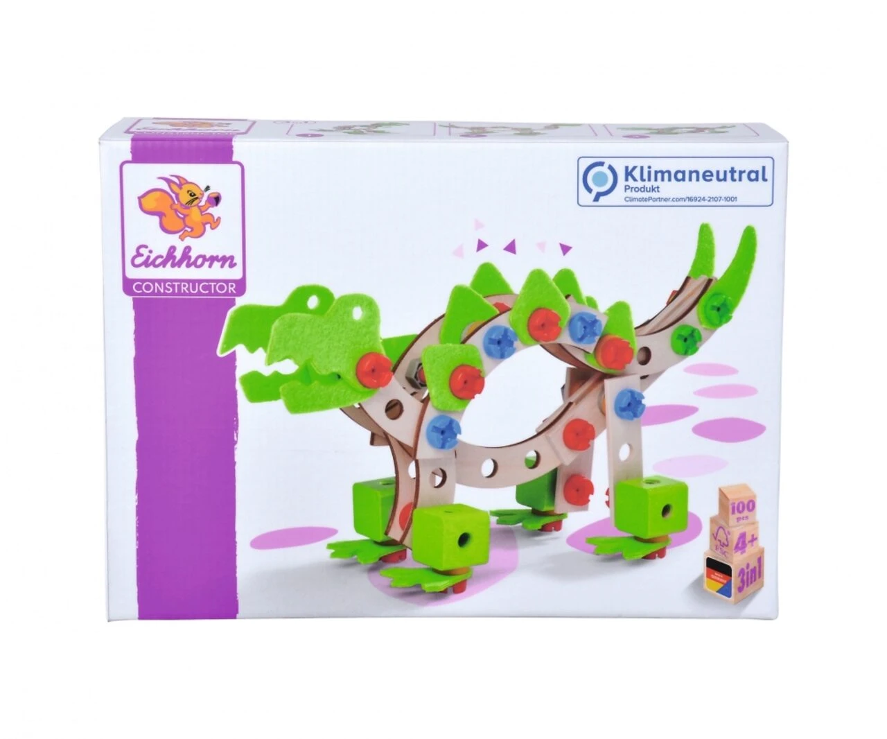Eichhorn Constructor Dinosaurier: Baue dir aus 100-Teilen eins von 3 möglichen Dino-Modellen. Mit Hilfe der mitgelieferten Werkzeuge, der Anleitung und den Schrauben werden die Holzteile und Verbindungselemente miteinander fixiert und eines der Modelle entsteht. Der Dinokopf ist jeweils aus angenehmem festem Filz.