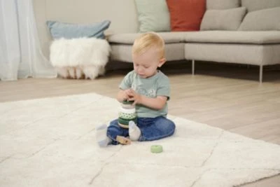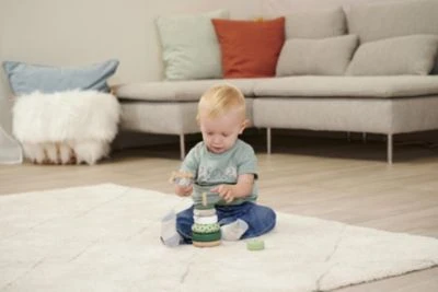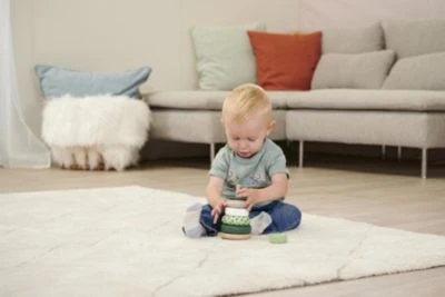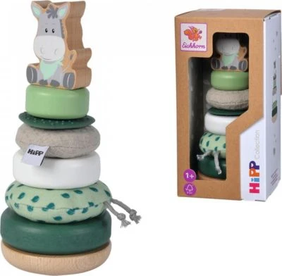 Der Stapelturm aus der Eichhorn Baby HiPP Collection: Mit dem 19 cm großen, in verschiedenen Grüntönen gehaltenen Steckturm der Eichhorn Baby HiPP Collection werden die Kleinen spielerisch mit Größenverhältnissen vertraut gemacht. Der Stapelturm fördert die Geschicklichkeit, die Hand-Augen-Koordination und die Fingerfertigkeit der Kinder. Die acht bunten kleinen Ringe aus Stoff, Holz und Silikon in verschiedenen Größen können der Reihe nach sortiert oder nach Belieben kunterbunt übereinandergestapelt werden. Der Stab zum Aufstecken ist angenehm flexibel.