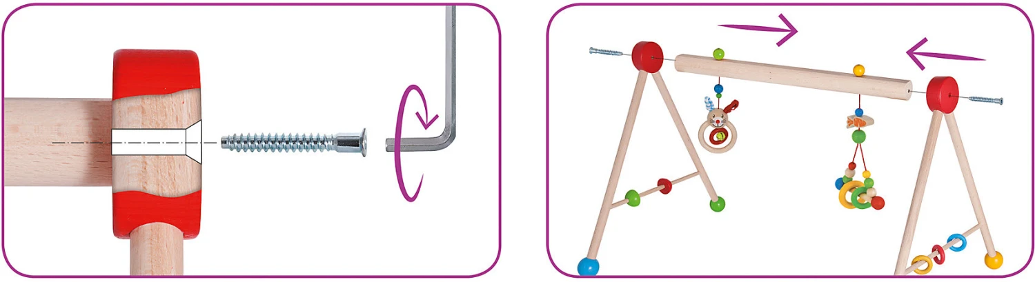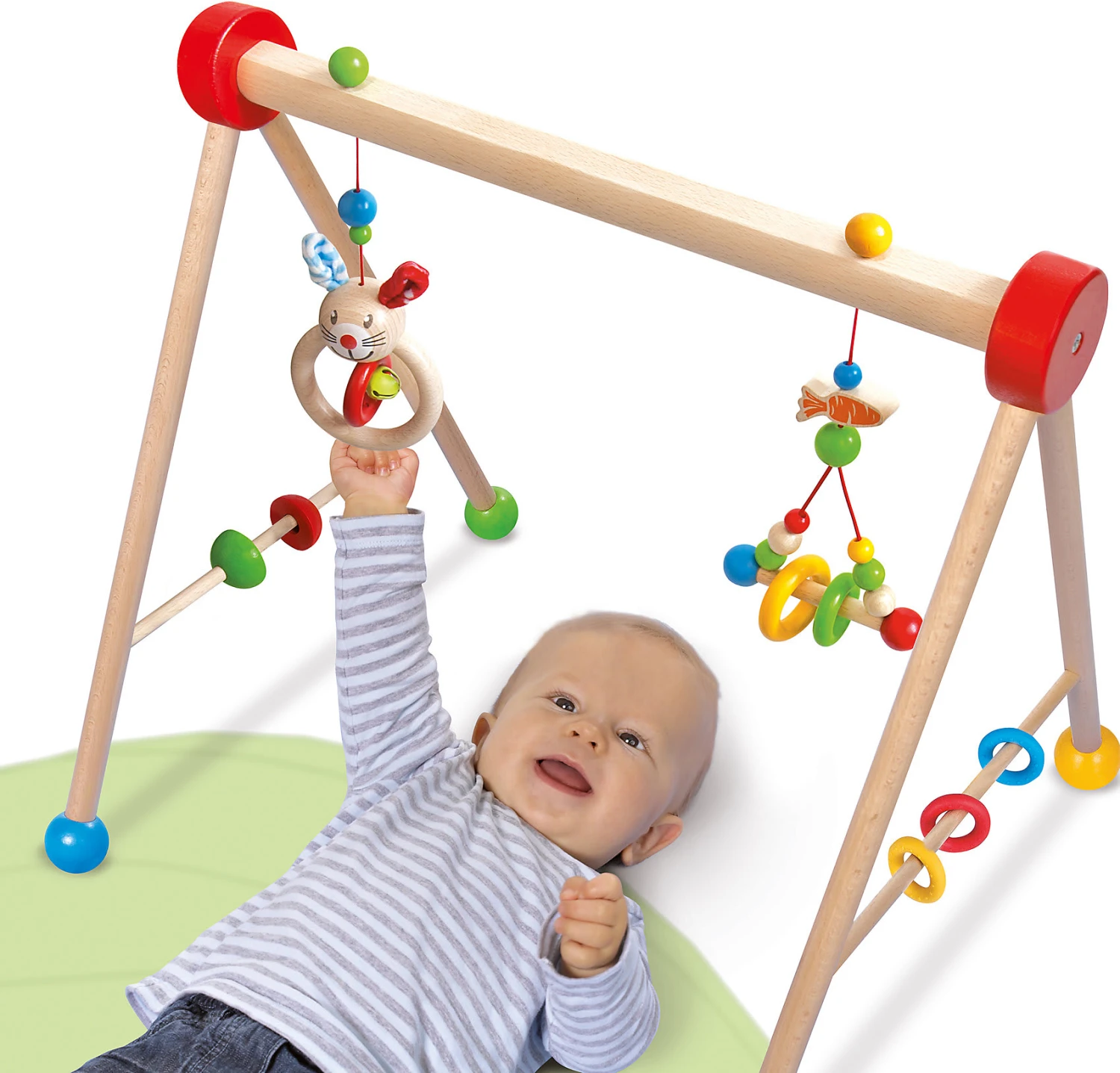 Mit dem farbenfrohen Baby Gym von Eichhorn Baby und seinen Spielaktivitäten und Geräuschen wird gezieltes Greifen, Geschick, Reaktion und Konzentration trainiert. Spieltrapez Hase von Eichhorn ab 3 Monaten aus Buchenholz und Plüsch Made in Germany Am Baby Gym sind zwei Spielzeuge zum Greifen aufgehängt, jedes mit einer anderen spannenden Funktion: ein kleines Glöckchen, verschiedene Materialien und das kleine süße Hasenköpfchen mit Plüschohren. An den Seiten sind Elemente zum Drehen und Beißringe aus Gummi für kleine Babys zum Spielen befestigt. Für die Herstellung des Eichhorn Baby Gyms wird ausschließlich FSC® 100% Holz aus nachhaltiger Forstwirtschaft verwendet.