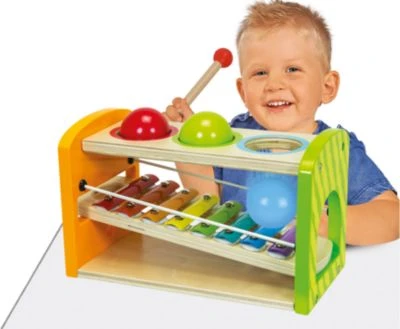 So vielseitig kann ein Spielzeug sein! Dieses farbenfrohe Holzspielzeug von Eichhorn ist Klopfbank und Xylophon in einem.