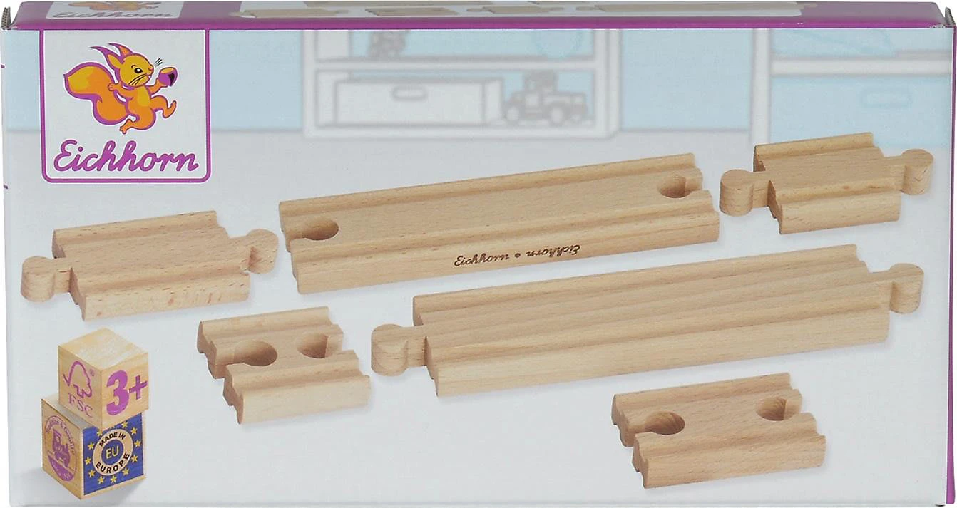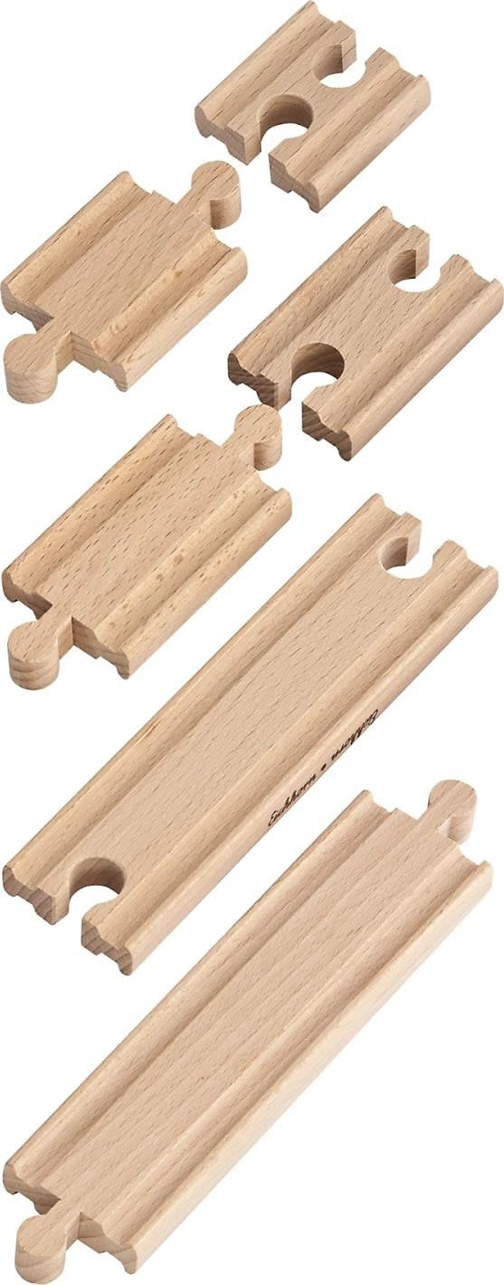 Dieses Erweiterungspaket enthält sechs Schienen. Zwei lange Geraden, zwei kurze Geraden und zwei Ausgleichsschienen. Sie sind mit fast allen Schienenbahnen kombinierbar.