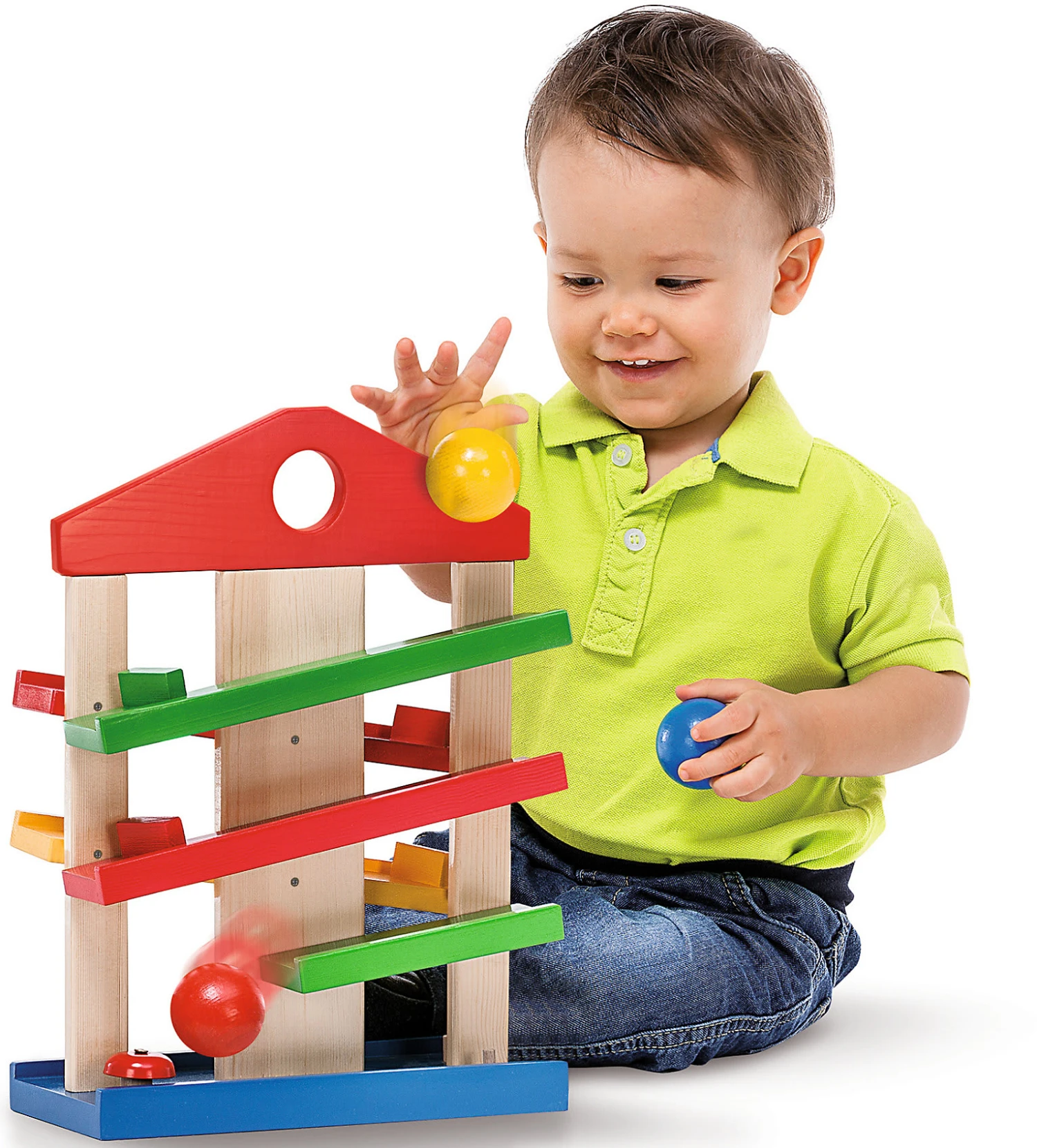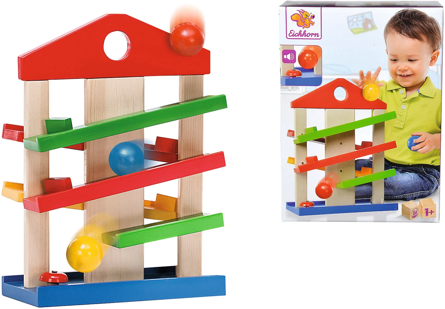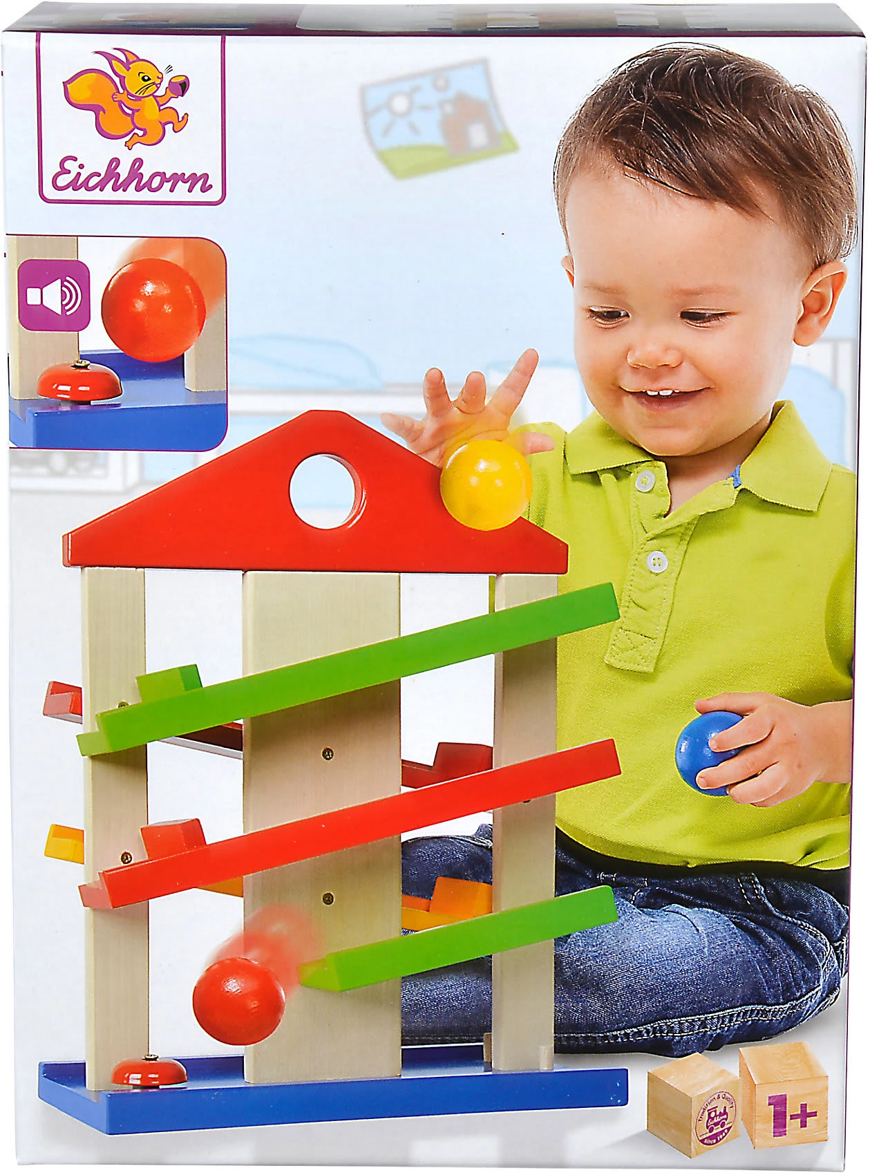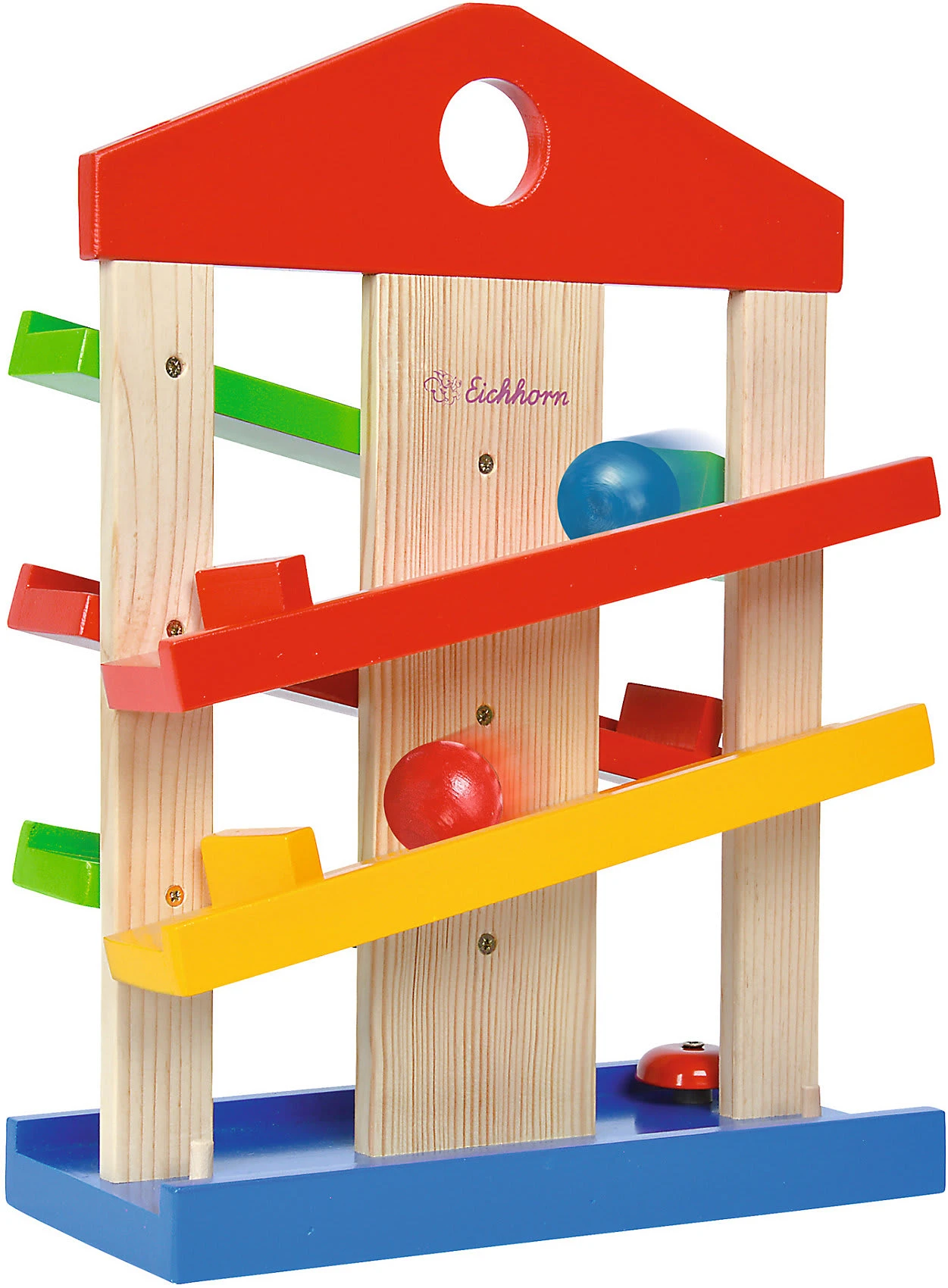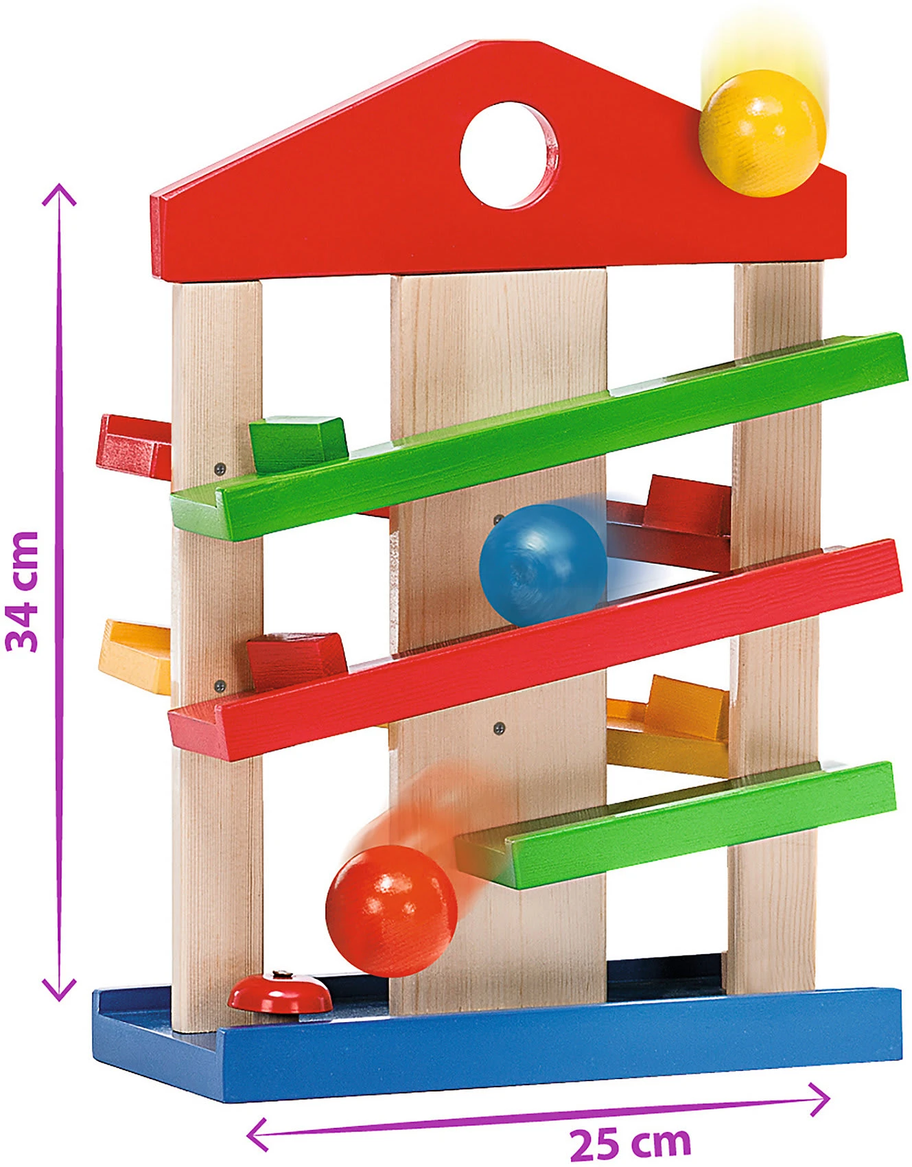 Dieses kleine Rollbahnhaus mit drei farbigen Kugeln besteht aus fünf Holzlaufbahnen, die Kugeln laufen sogar um die Ecke! Die Ankunft wird durch das Bimmeln eines kleinen Glöckchens belohnt.