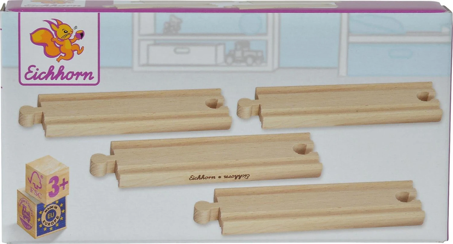 Dieses Erweiterungspaket enthält vier gerade Schienen für die Erweiterung der Schienenbahn. Sie sind mit fast allen Schienenbahnen kombinierbar.