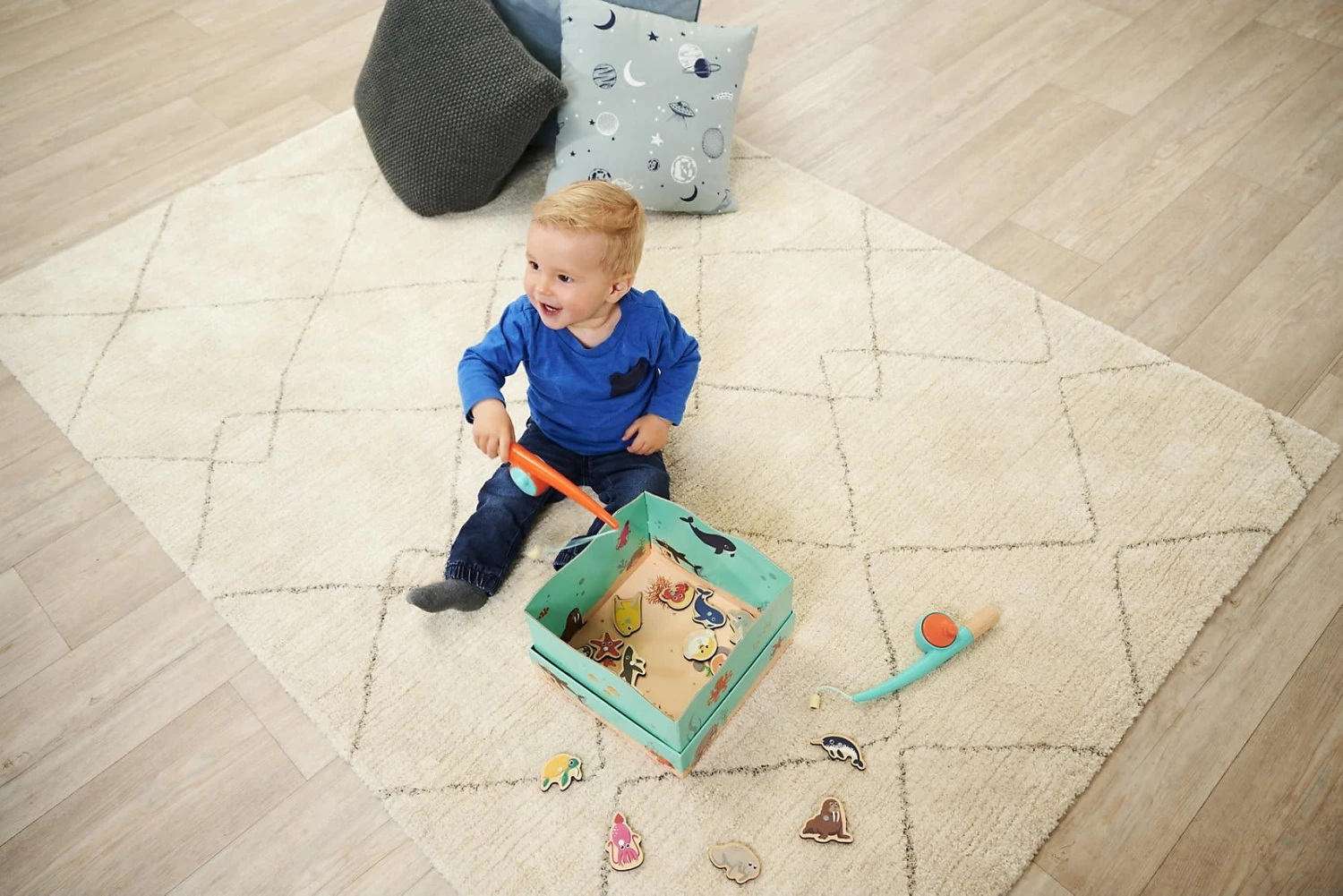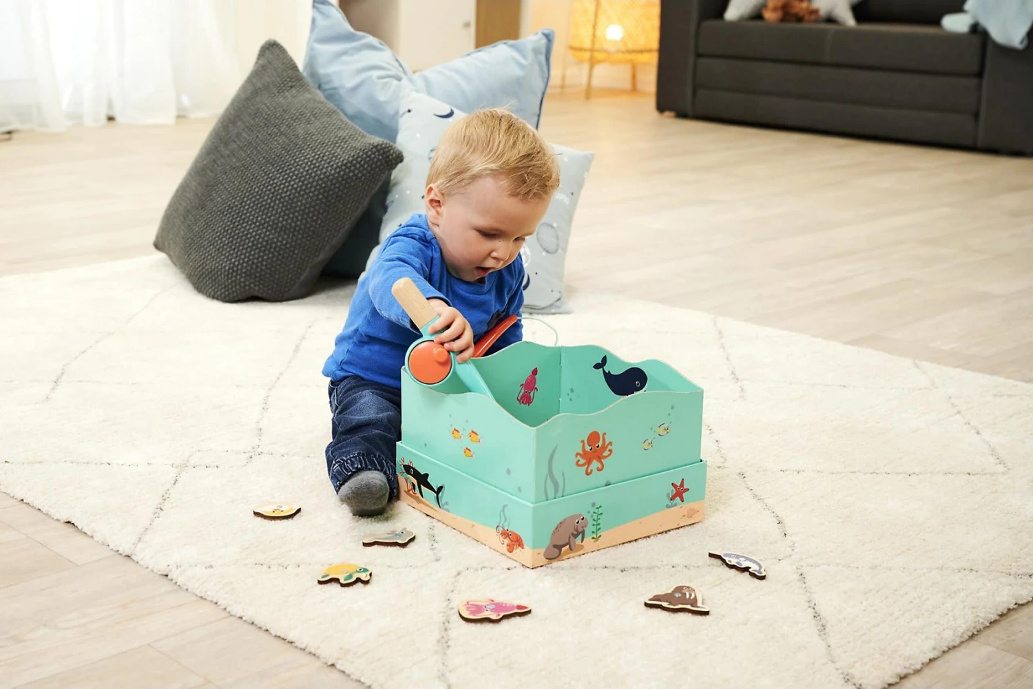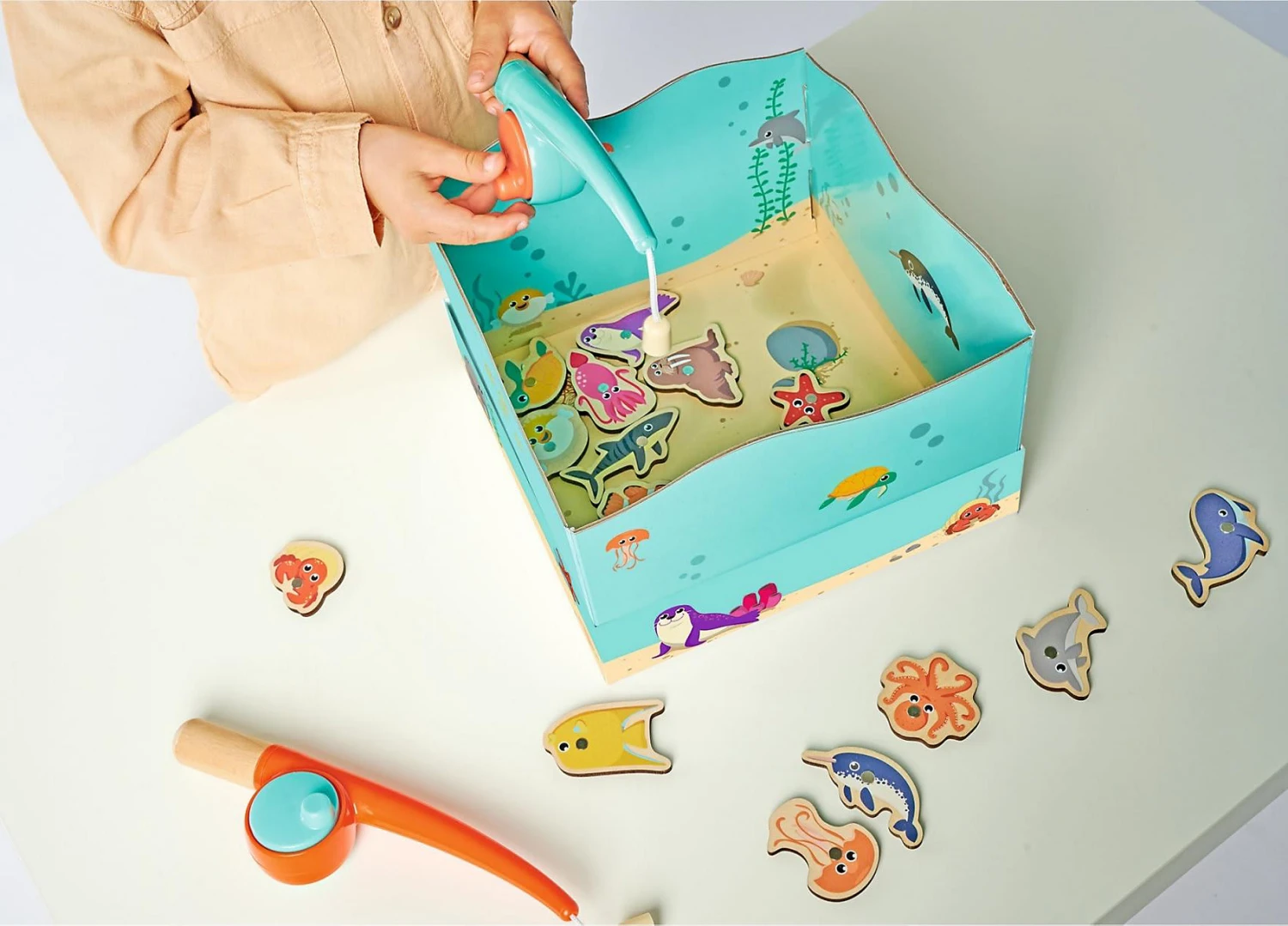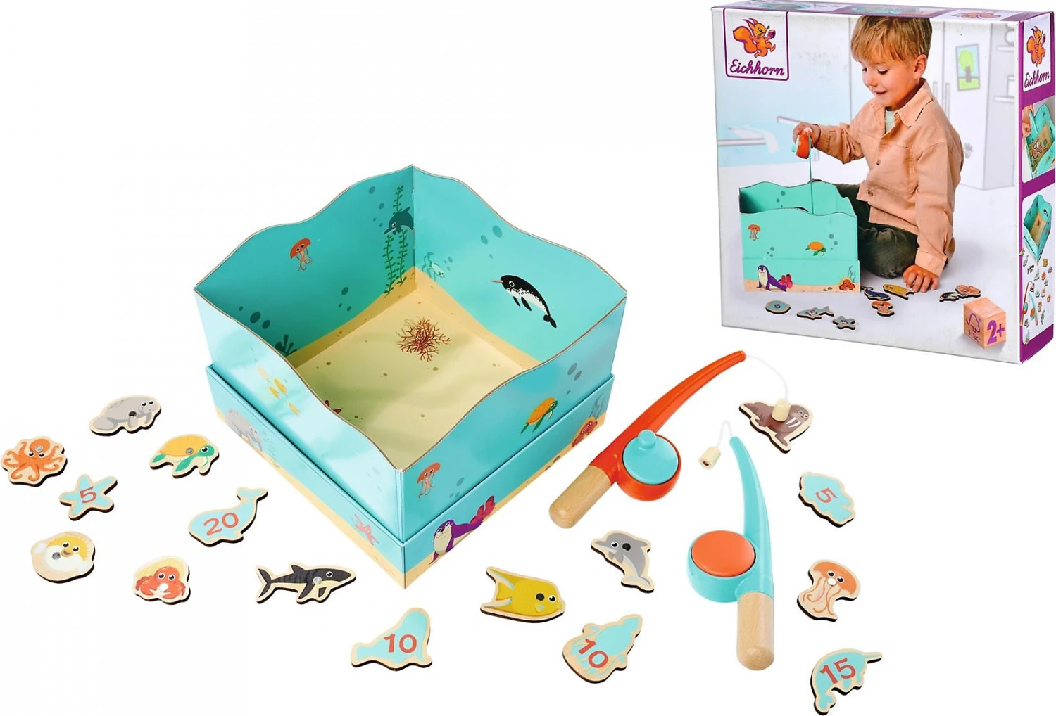 Mit diesem tollen Magnet-Angelspiel aus dem Hause Eichhorn können Kinder spielerisch ihre feinmotorischen Fähigkeiten trainieren! In dem „Aquarium“ befinden sich sechzehn Meerestiere, die mit den magnetischen Angeln herausgefischt werden. Die Nummern auf den Rückseiten der FIsche geben an, wie viele Punkte sie wert sind. Wer die meisten Punke angelt, gewinnt.