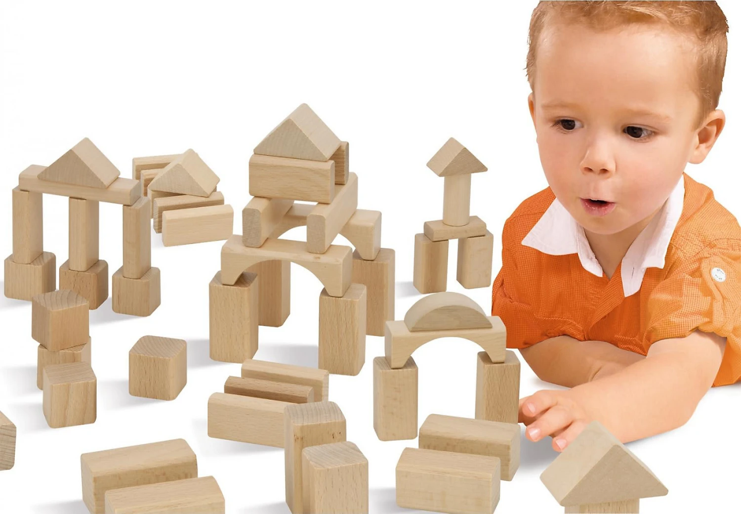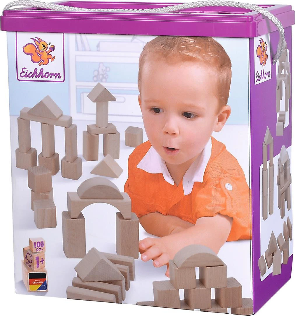 Mit den Holzbausteinen von Eichhorn haben kleine Baumeister zahlreiche Möglichkeiten, kreativ zu werden. Das Set mit der praktischen Aufbewahrungsbox enthält 100 verschiedene Klötze aus nachhaltig angebautem Buchenholz. Holzbausteine von Eichhorn Aufbewahrungsbox mit Deckel und Kordel, 100 Bauklötze in verschiedenen Formen ab 12 Monaten Made in Germany Gleich 100 Bauklötze laden Kinder ab zwölf Monaten ein, Türme zu stapeln, Gebäude zu errichten oder Formen zu sortieren. Die naturfarbenen Bausteine sind aus nachhaltig angebautem Buchenholz gefertigt und werden in einer praktischen Aufbewahrungsbox mit Deckel geliefert. Durch die Beschäftigung mit den Holzbausteinen trainiert der Nachwuchs spielerisch seine Motorik und die Hand-Auge-Koordination. Das Bauen verbessert sein räumliches Vorstellungsvermögen. Werfen die Kids ihre Bauprojekte um, entdecken sie außerdem das Prinzip von Ursache und Wirkung.
