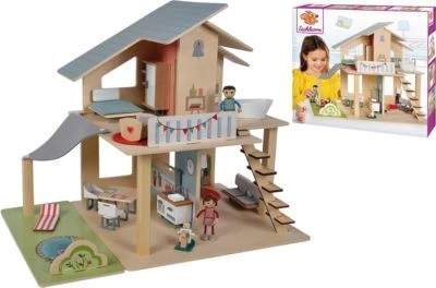 Das geräumige Puppenhaus bietet viel Platz für tolle Geschichten und kleine Abenteuer verteilt über zwei Etagen mit einem Schlafzimmer, Badezimmer, Küche und Wohnzimmer. Die obere Etage ist mit einer Treppe erreichbar. Das süße Puppenhaus hat sogar einen kleinen Außenbereich mit einer Liege zum Entspannen.