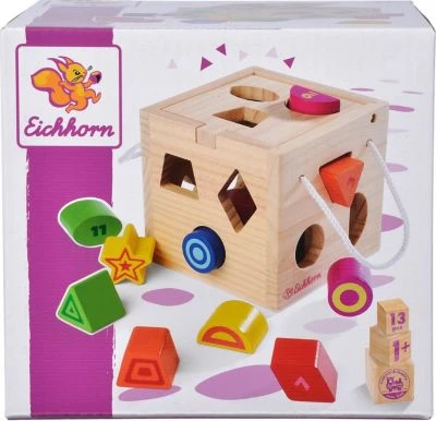 Die Sortierbox mit Kordel von Eichhorn sorgt für kunterbuntes Sortier-Vergnügen. Die unterschiedlichsten Farben und Formen wecken das Interesse der kleinen Entdecker. Sortierbox mit 13 Teilen 15(L) x 15(B) x 14(H) cm aus Holz ab 12 Monate In dieser tollen Sortierbox finden die Kleinen lustig bunte Sortiersteine, die eine handliche Größe haben. Für jede der unterschiedlichen Stein-Formen gibt es in der Box eine passende Aussparung. Nun gilt es, die Formen in die passenden Öffnungen zu stecken. Das bringt viel Freude und trainiert nebenbei die Motorik. Ebenso lehrreich ist die Wahrnehmung der unterschiedlichen Formen und Farben. Die Box lässt sich leicht öffnen und der Kordel-Griff sorgt für einen einfachen Transport.