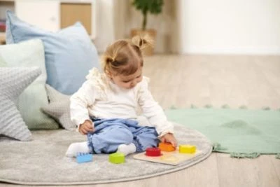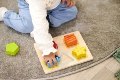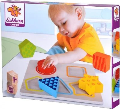 Das Sortierpuzzle von Eichhorn fördert die Feinmotorik und hilft den Kindern dabei, die verschiedenen Formen und Farben zu lernen. Die fünf bunten Formbausteine können in die passenden Holzaussparungen auf der Platte gelegt werden.