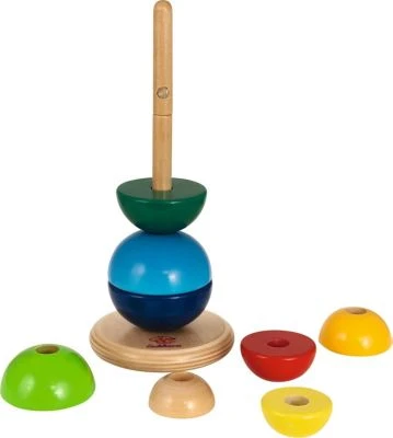 Das bunte Steckturm-Set besteht aus einem Stab und acht Halbkugeln in vier verschiedenen Größen.